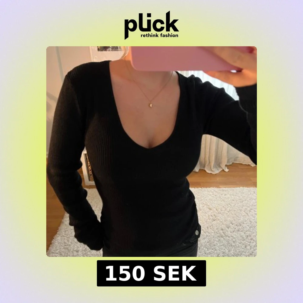 Säljer en svart ribbad långärmad tröja med djup v-ringning. Tröjan är figurnära och har en stretchig, stickad känsla som sitter snyggt på kroppen. Perfekt för lager-på-lager eller som den är till jeans.💕💕