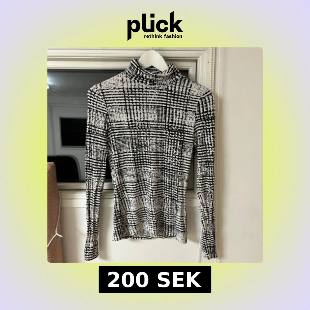 Snygg svartvit polotröja från H&M med ett unikt rutigt mönster. Tröjan har långa ärmar och en tight passform, perfekt för en stilren look. Passar bra till både jeans och kjol.