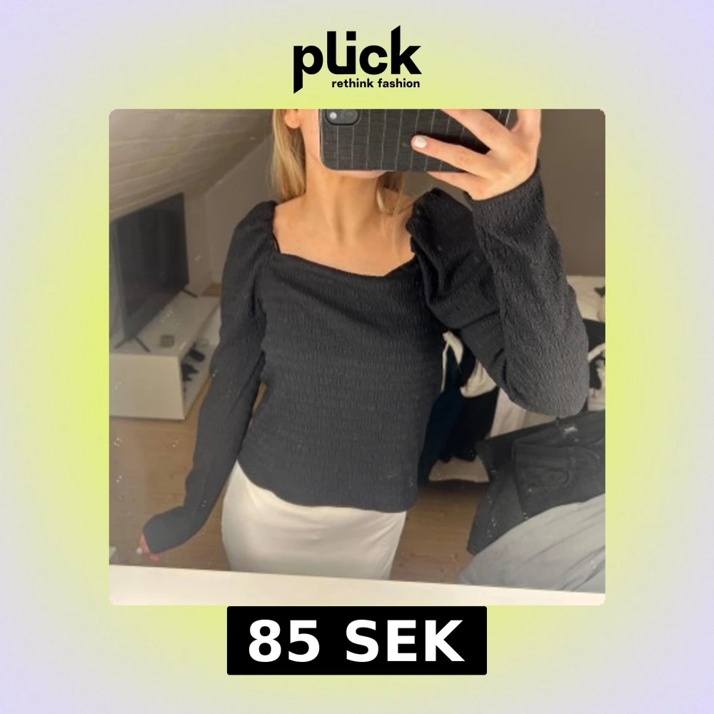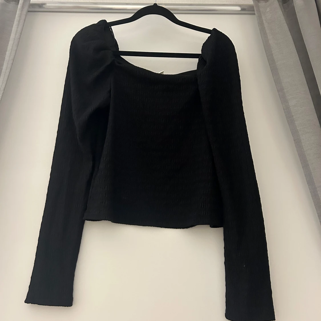 Snygg svart ribbad topp med långa ärmar och en fyrkantig halsringning. Perfekt för en stilren look.