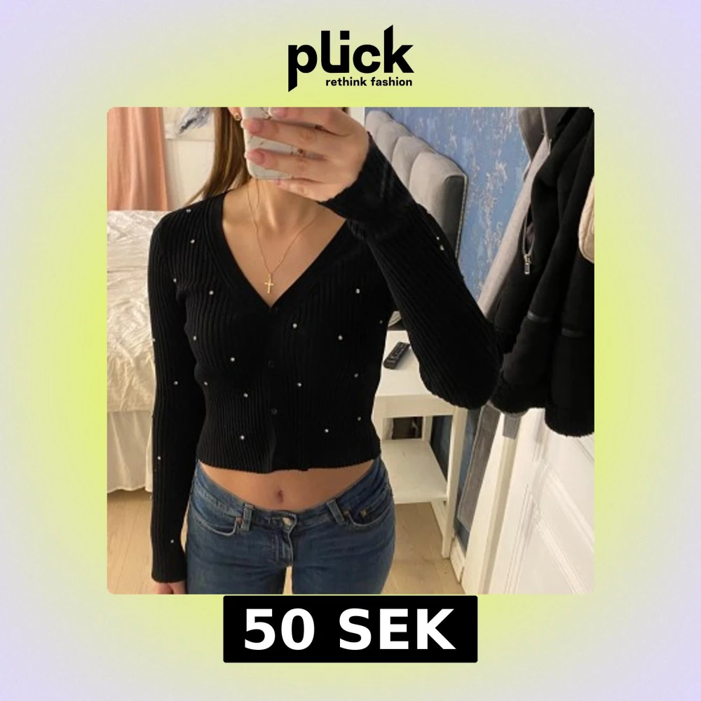 Snygg svart ribbad kofta med v-ringning och knappar framtill. Dekorerad med små stenar som ger en elegant touch.