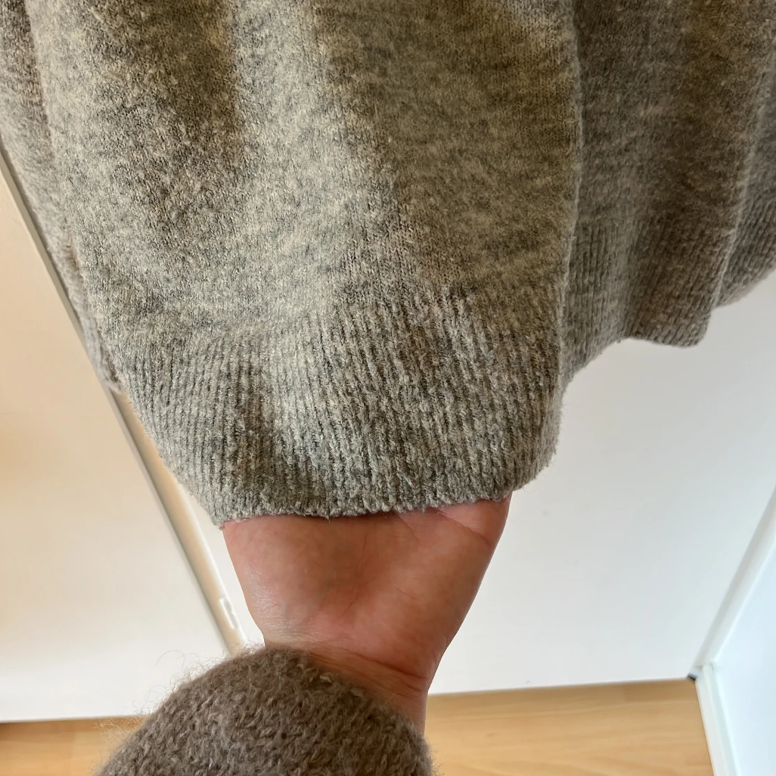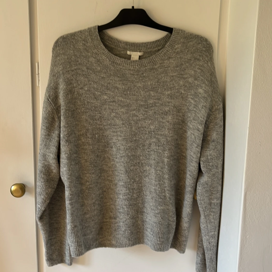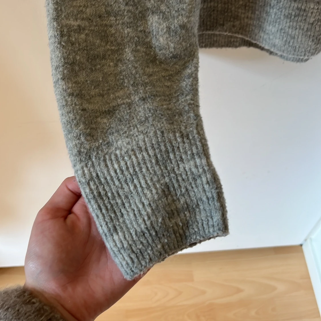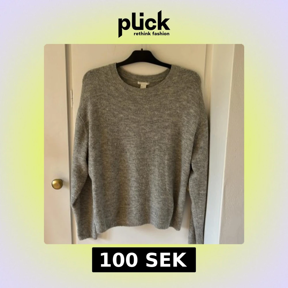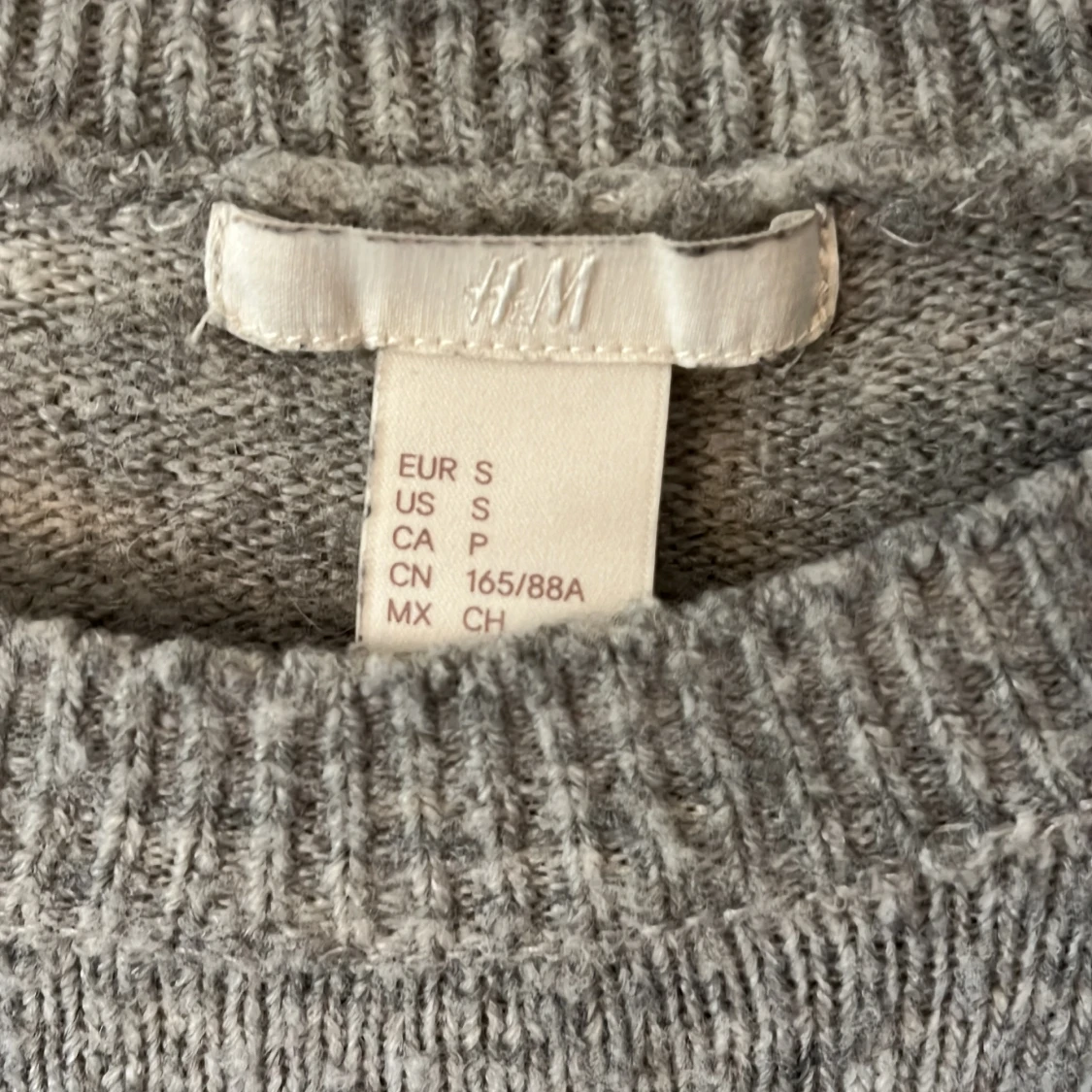 Mysig grå stickad tröja från H&M i storlek S. Tröjan har rund halsringning, ribbade muddar vid ärmslut och nederkant samt en loose passform. Perfekt för lager-på-lager under kyliga dagar.