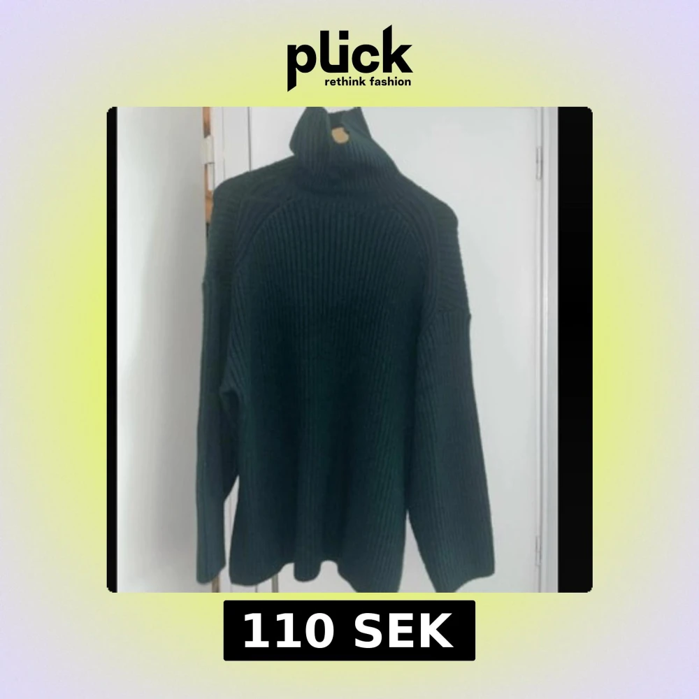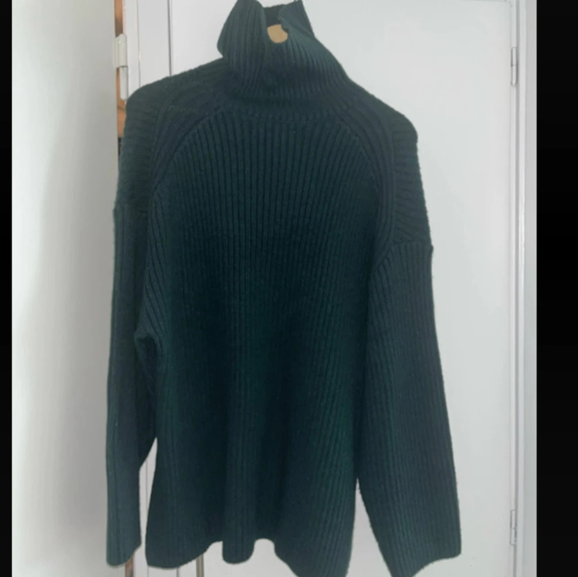 Mysig mörkgrön stickad polotröja med hög krage och breda, långa ärmar. Tröjan har en ribbad struktur som ger en cool och avslappnad vibe, perfekt för kyliga dagar. Passformen är loose och den funkar lika bra till jeans som till kjol.