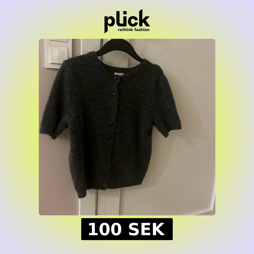 Mysig mörkgrå stickad kofta från H&M med korta ärmar och rund hals. Koftan har knappar framtill och en mjuk, lite fluffig yta som ger en chill vibe. Perfekt att slänga över en t-shirt eller linne för extra värme.