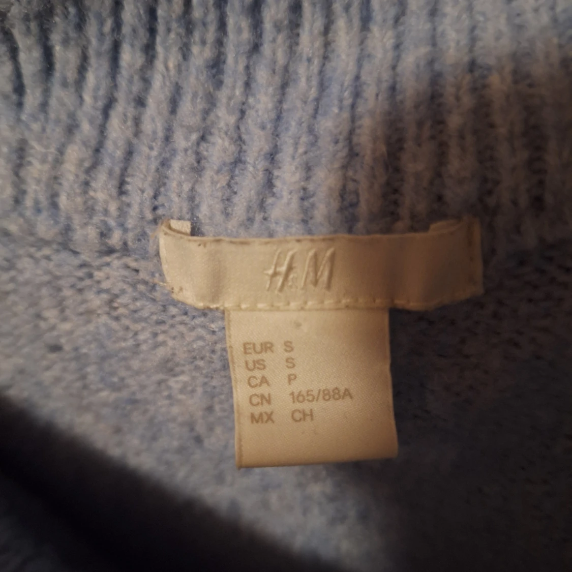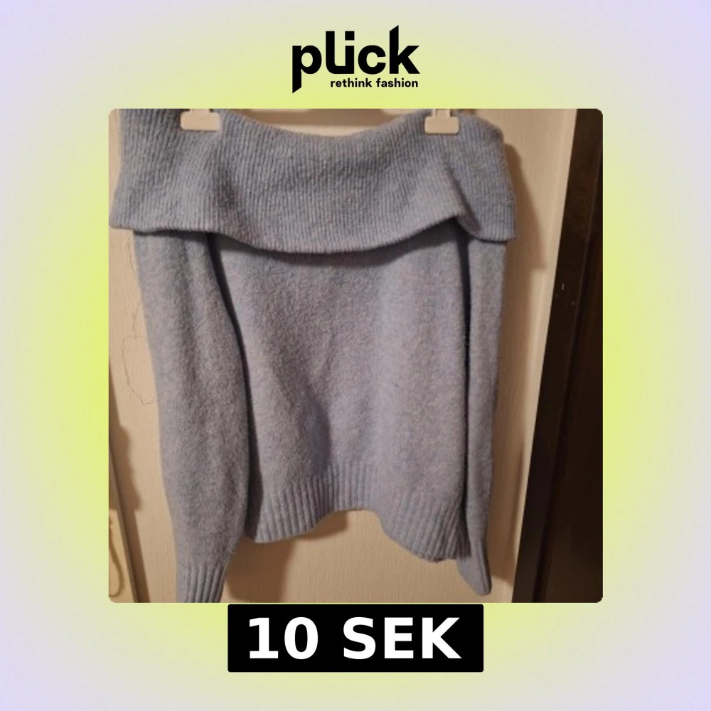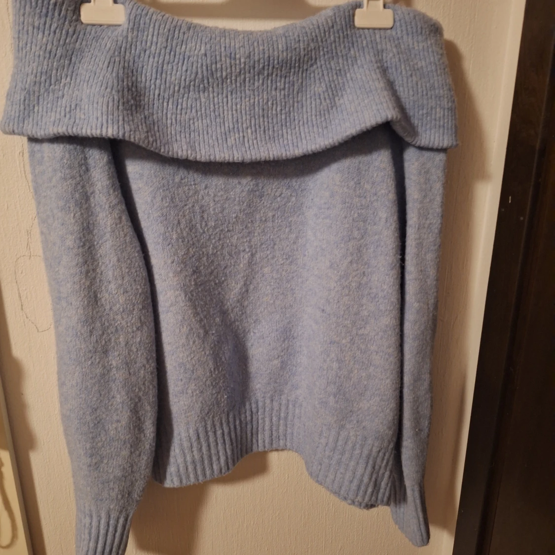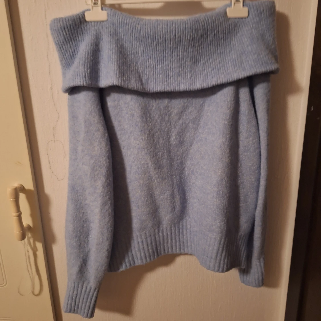 Supermysig ljusblå stickad tröja från H&M i storlek S. Tröjan har en bred, ribbad offshoulder-krage och långa ärmar med ribbade muddar. Perfekt för dig som gillar chill och snygg stil med lite extra edge.