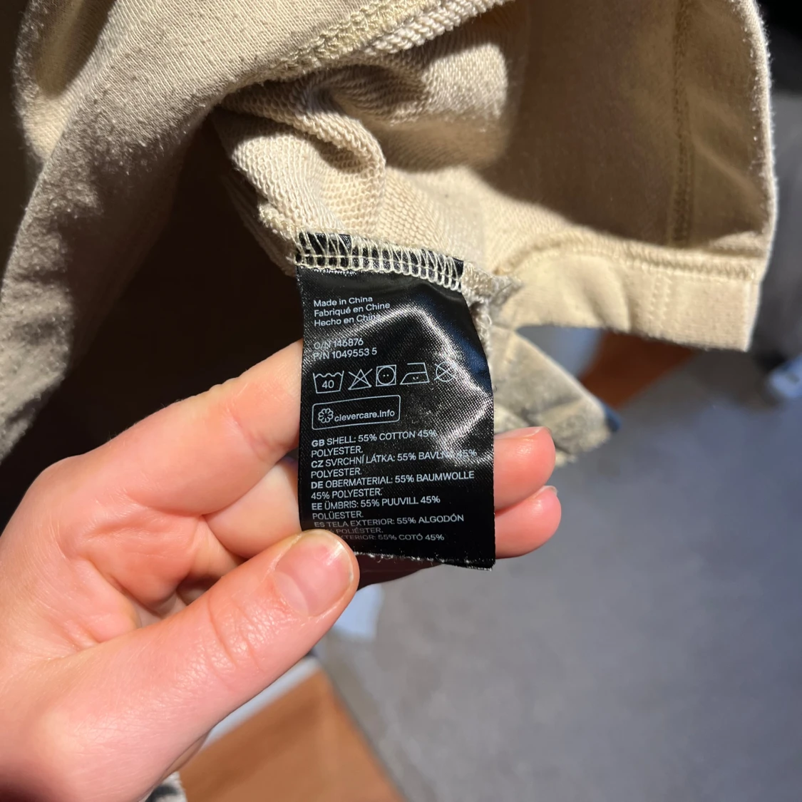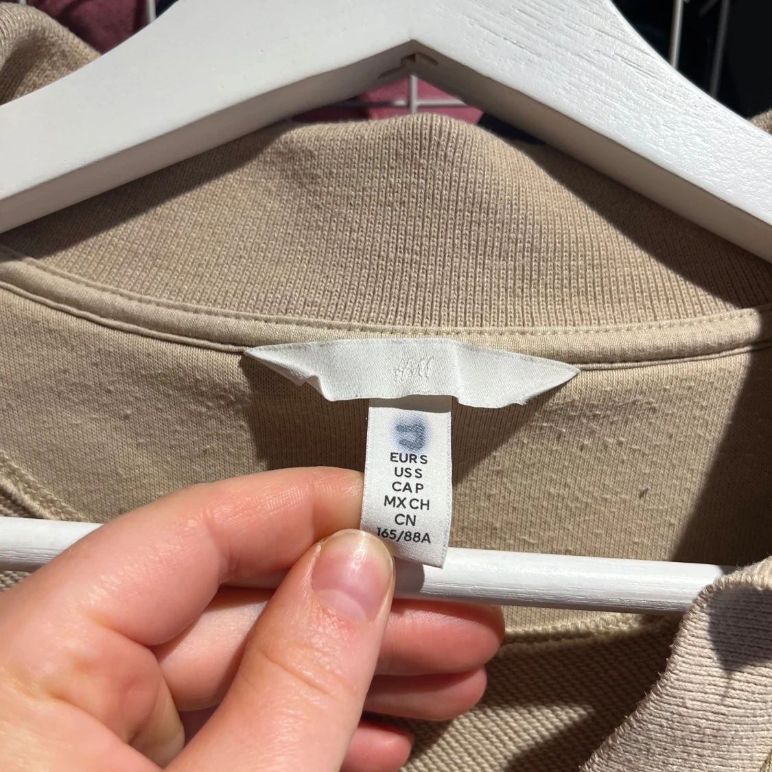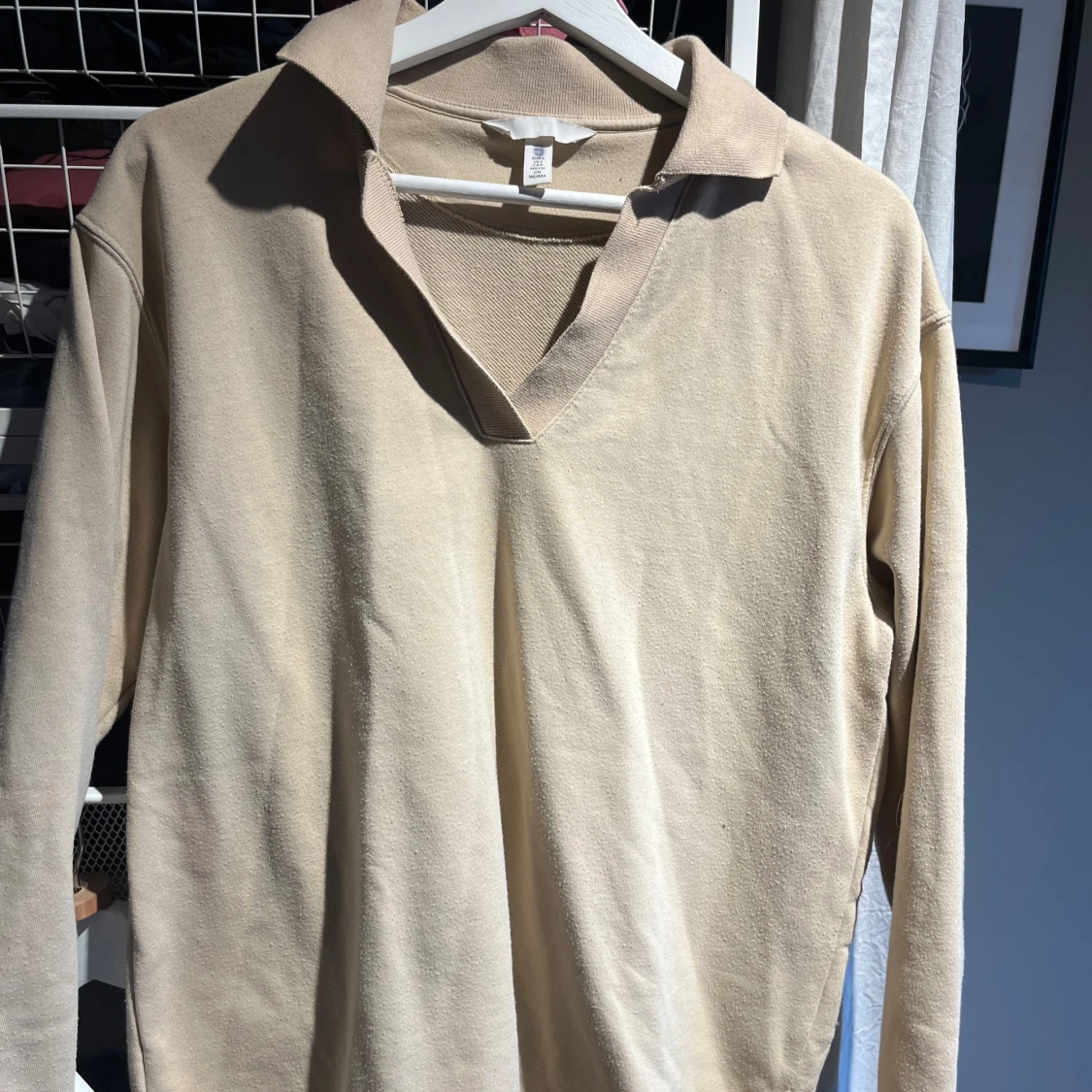 Säljer en stilren beige långärmad tröja från H&M. Tröjan har en klassisk krage och är tillverkad i en mjuk bomullsblandning. Perfekt för en avslappnad look.
