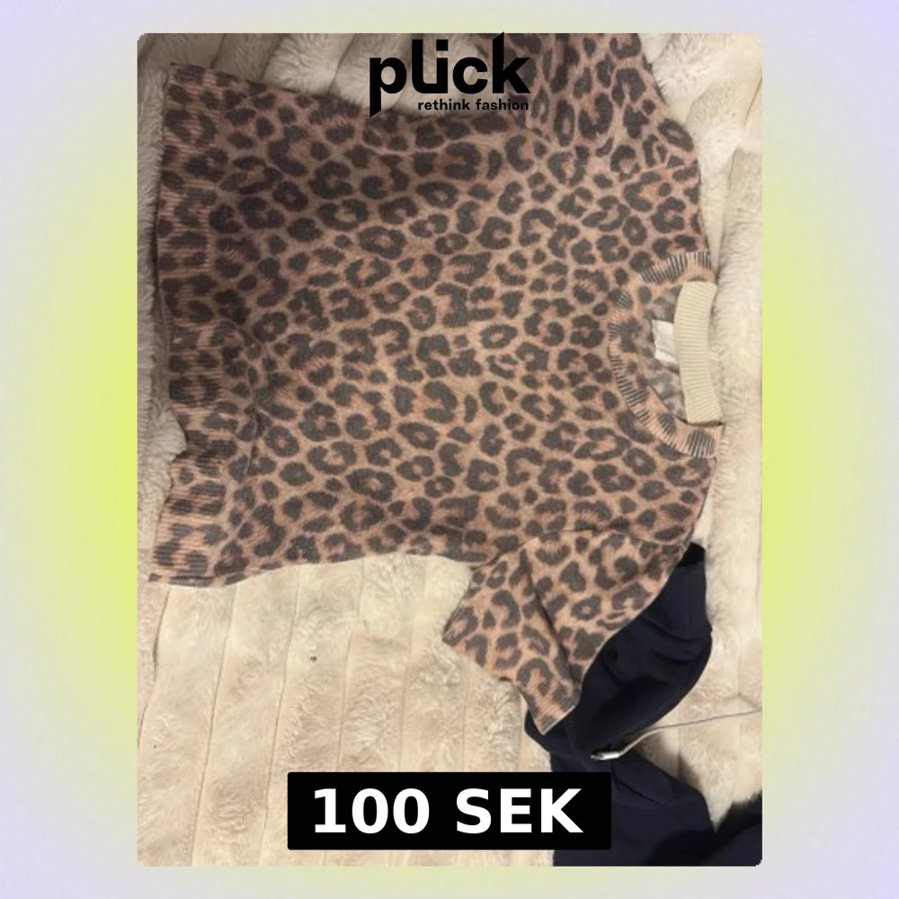 Säljer en trendig kortärmad tröja med leopardmönster i beige och bruna toner. Tröjan har ribbad rund halsringning och är gjord i ett mjukt stickat material. Perfekt för dig som vill sticka ut med ett djurmönster i garderoben.