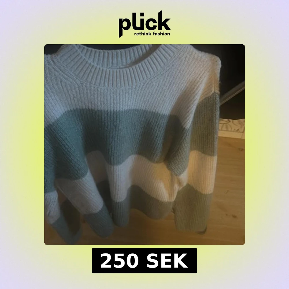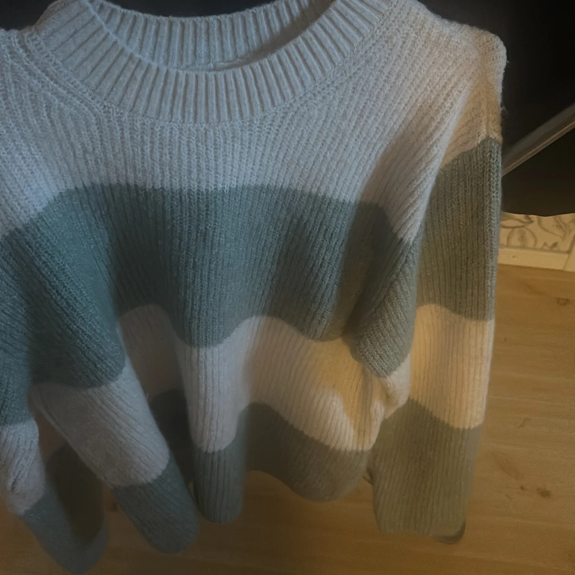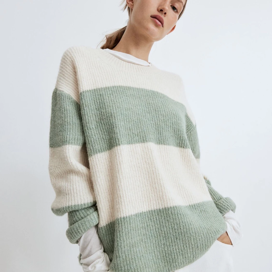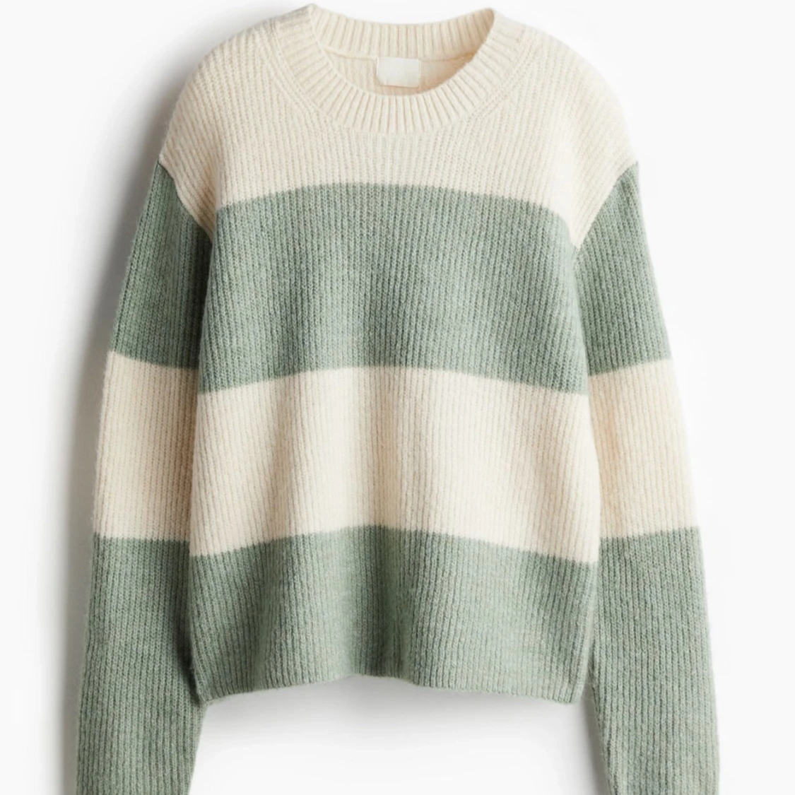 Mysig stickad tröja med breda ränder i grönt och vitt. Tröjan har en avslappnad passform och långa ärmar, perfekt för kyliga dagar. Den ribbade halsringningen ger en klassisk touch.