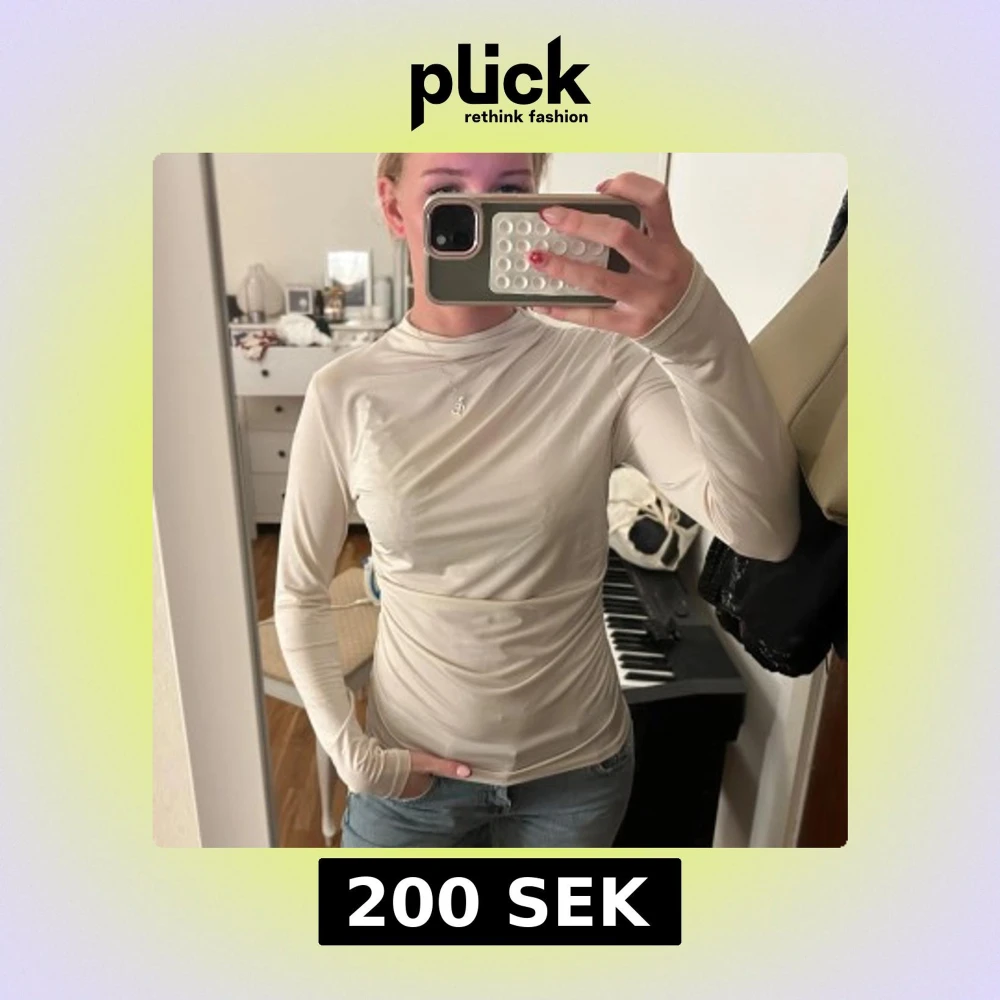 Säljer en beige långärmad topp med draperad effekt och hög hals. Toppen är tight och har en mjuk, stretchig känsla som sitter snyggt mot kroppen. Perfekt att styla med jeans eller kjol för en clean look.
