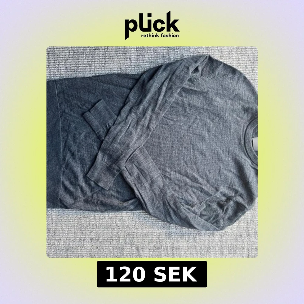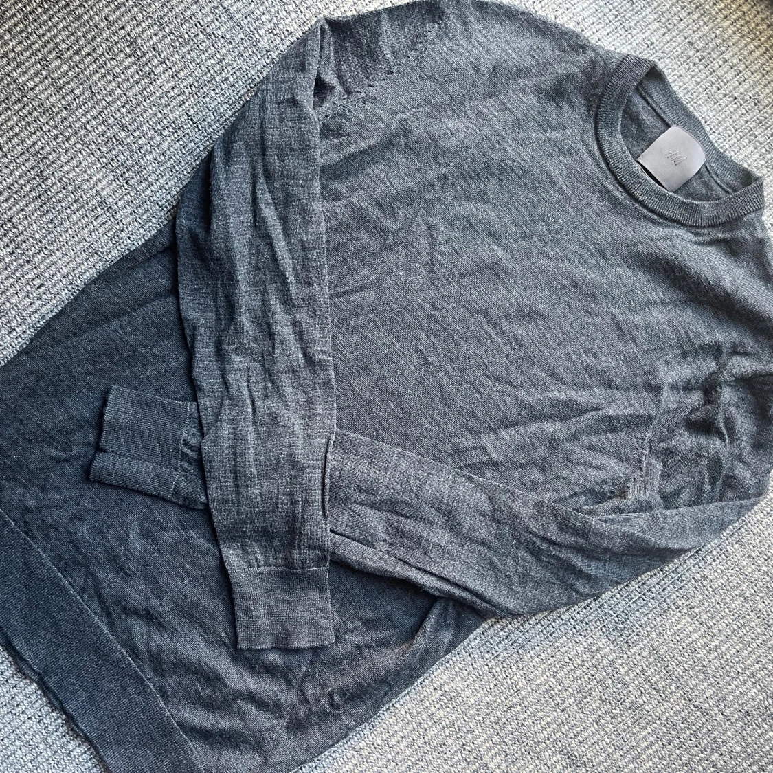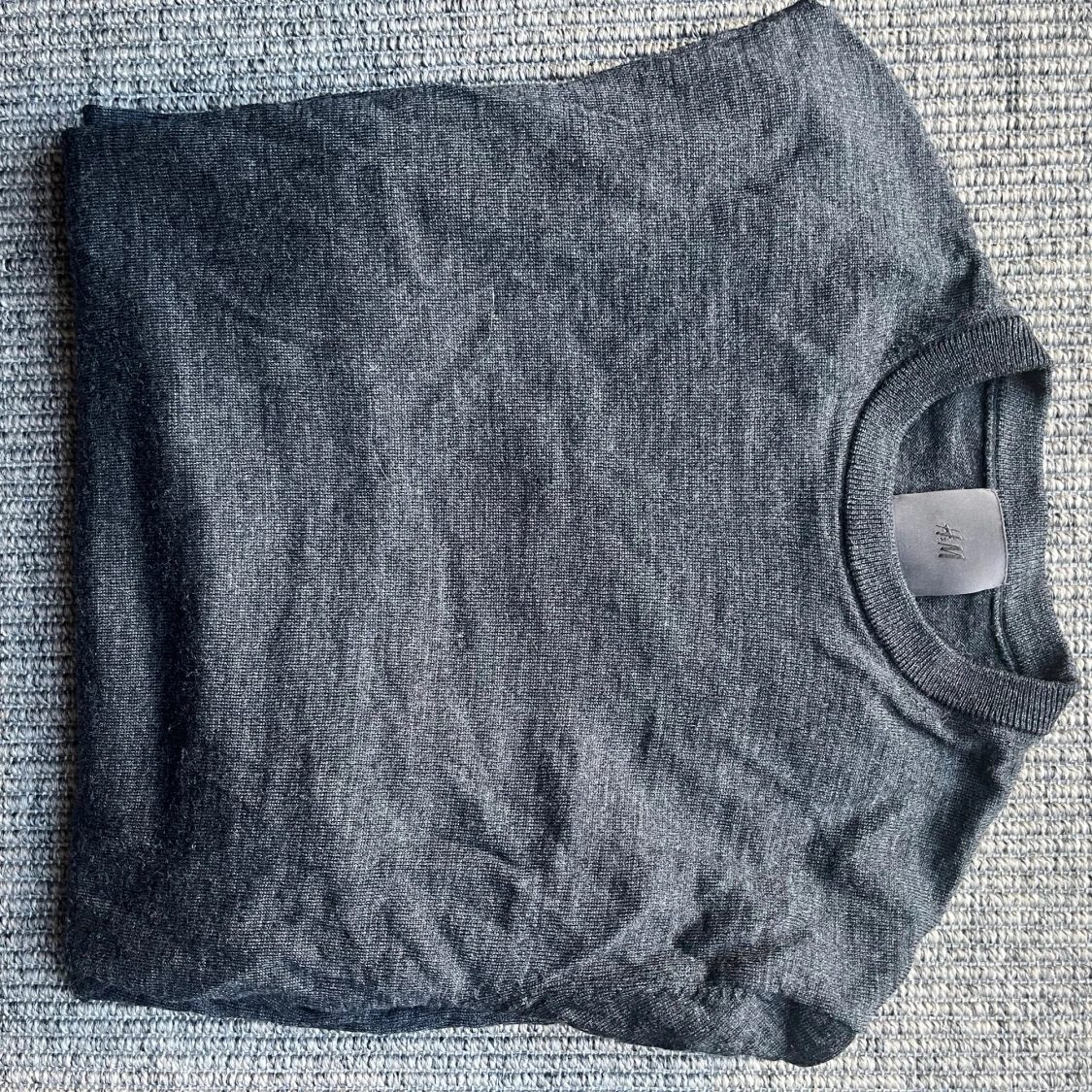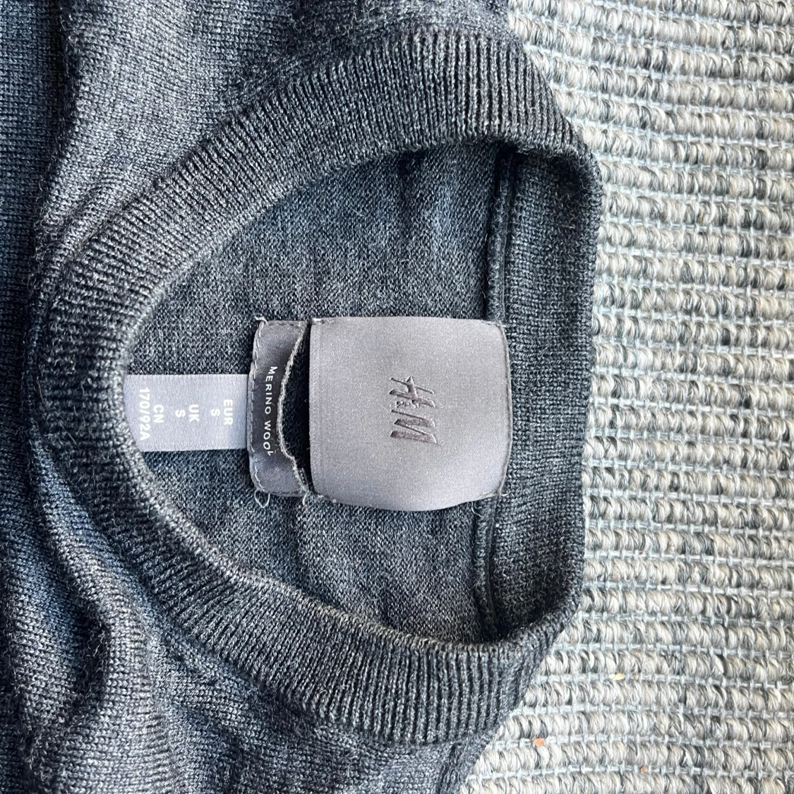 Säljer en stilren mörkgrå långärmad tröja från H&M i mjuk merinoull. Tröjan har rund halsringning och ribbade muddar vid ärmslut och nederkant. Perfekt för lager-på-lager under kyliga dagar.