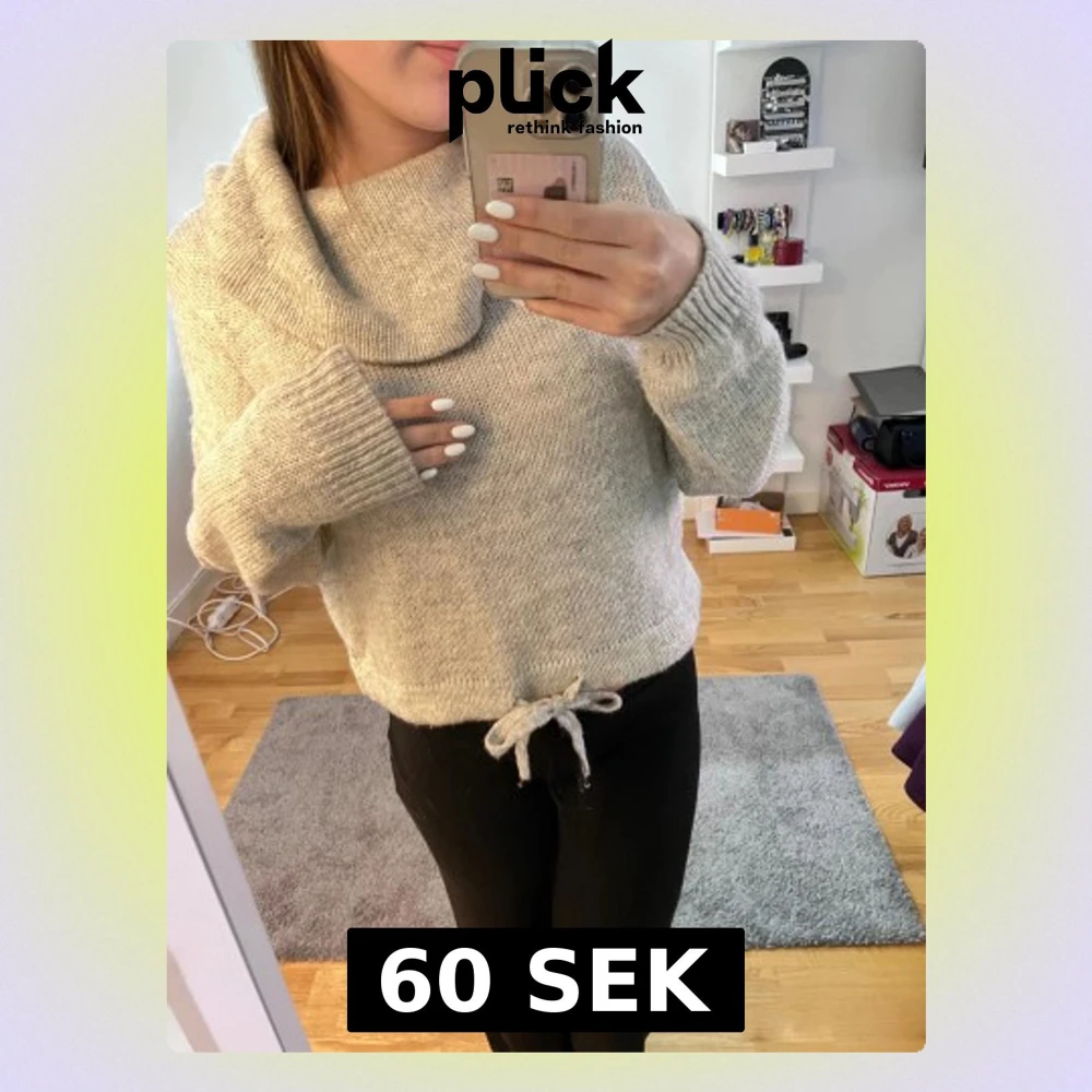 Supermysig beige stickad tröja från H&M i storlek S. Tröjan har en bred, nedvikt krage och långa ärmar med ribbade muddar. Nedtill finns en snygg knyt-detalj som ger extra stilpoäng. Perfekt för kyliga dagar och enkel att matcha med jeans eller leggings.