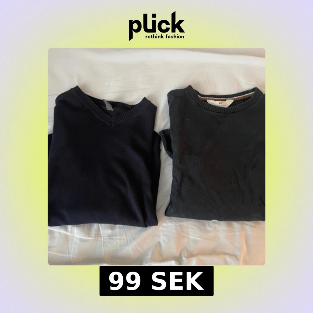 Två svarta stickade tröjor från H&M, en med v-ringning och en med rund hals. Båda har ribbade muddar vid hals och ärmslut. Perfekta att matcha med jeans eller chinos för en clean och enkel look.