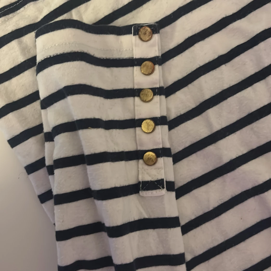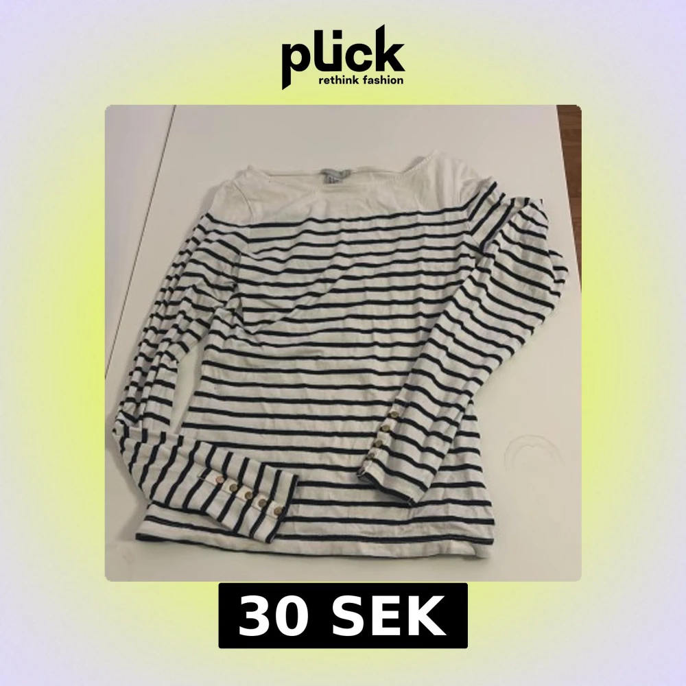 Vit och marinblå randig långärmad tröja från H&M. Tröjan har snygga guldknappar vid ärmsluten och en klassisk båtringad hals. Tillverkad i mjuk bomull, perfekt för en chill och stilren look.