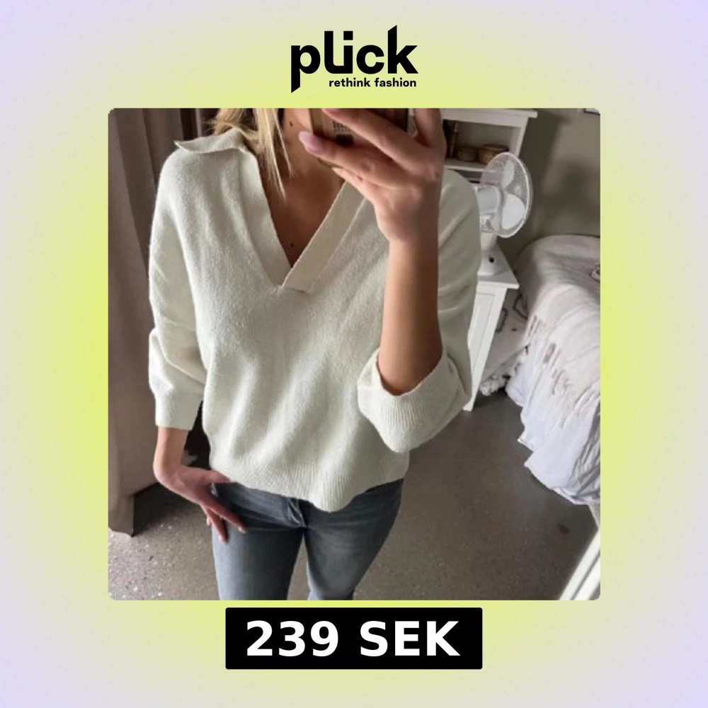 Säljer en stilren vit tröja med krage och v-ringning. Tröjan har trekvartsärmar och en avslappnad passform, perfekt för en casual look. Passar bra till jeans eller kjol.