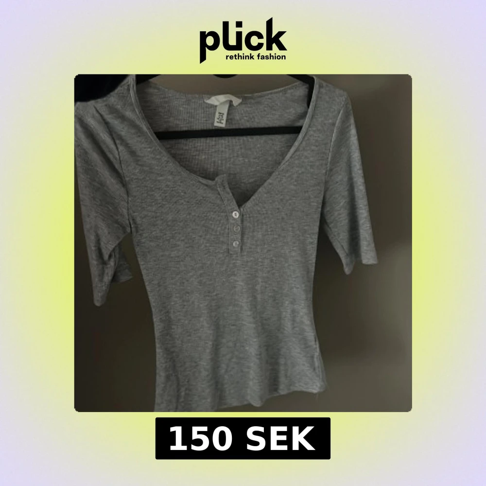 Säljer en stilren grå ribbad topp från H&M med trekvartsärm och knappar framtill. Perfekt för en avslappnad look. Passar bra till jeans eller kjol.