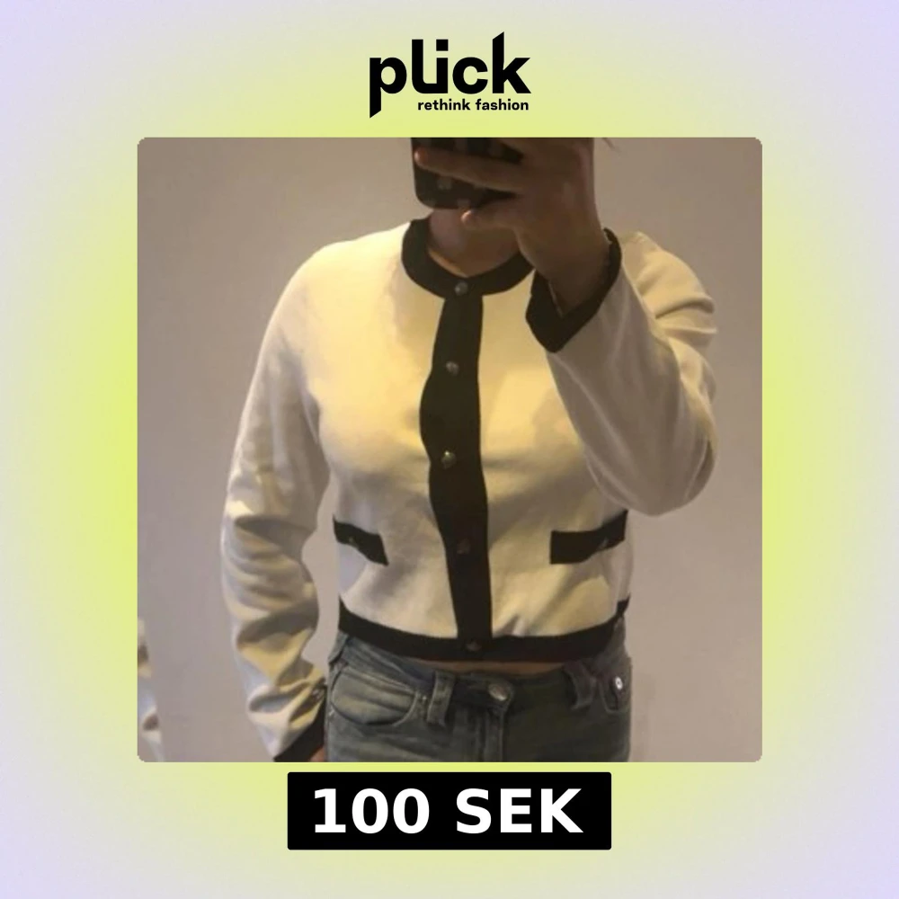 Säljer en stilren vit kofta från H&M med svarta detaljer vid krage, knappslå, fickor och nederkant. Koftan har långa ärmar, rund hals och dekorativa knappar framtill. Perfekt att matcha med jeans eller kjol för en chic look.
