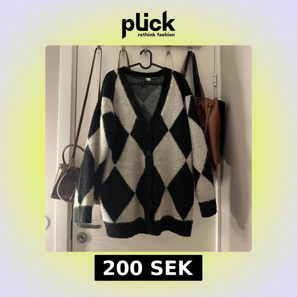 Säljer en oversized kofta från H&M i storlek S med svartvita rutor i ett snyggt harlequinmönster. Koftan har v-ringning, knappar framtill och är stickad i mjukt material. Perfekt för dig som gillar statement-plagg och vill ha en chill vibe.