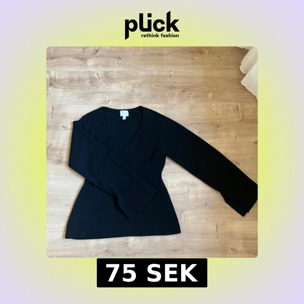 Snygg svart tröja med v-ringning och långa ärmar. Perfekt för en stilren look. Ribbstickade muddar vid ärmslut och nederkant ger en fin detalj. Även åtsittande i midjan.