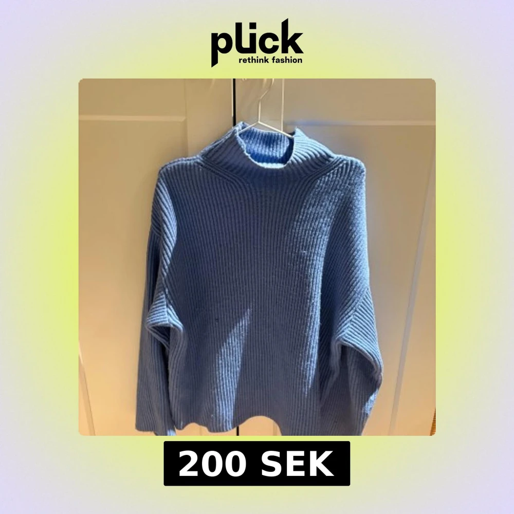 Säljer en mysig blå stickad tröja med ribbad struktur. Tröjan har en hög krage och långa ärmar. Tröjan har ett litet hål, men märks knappt av🩷