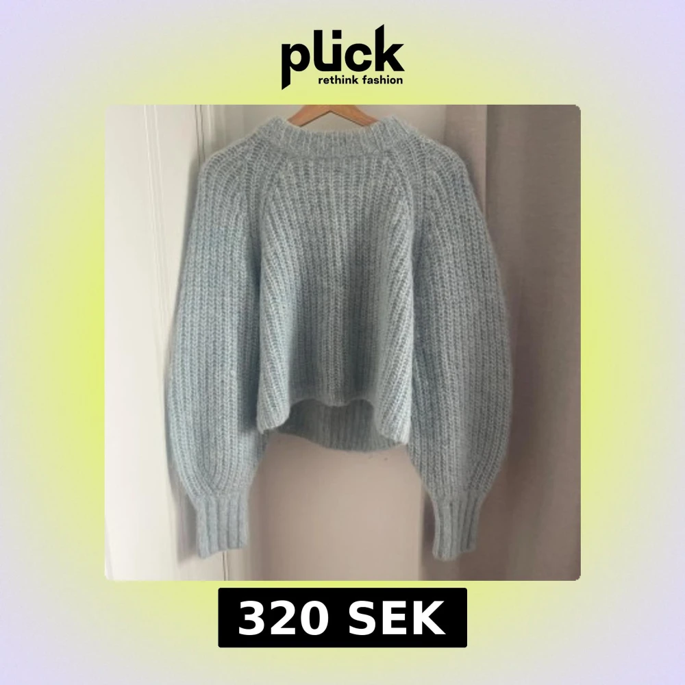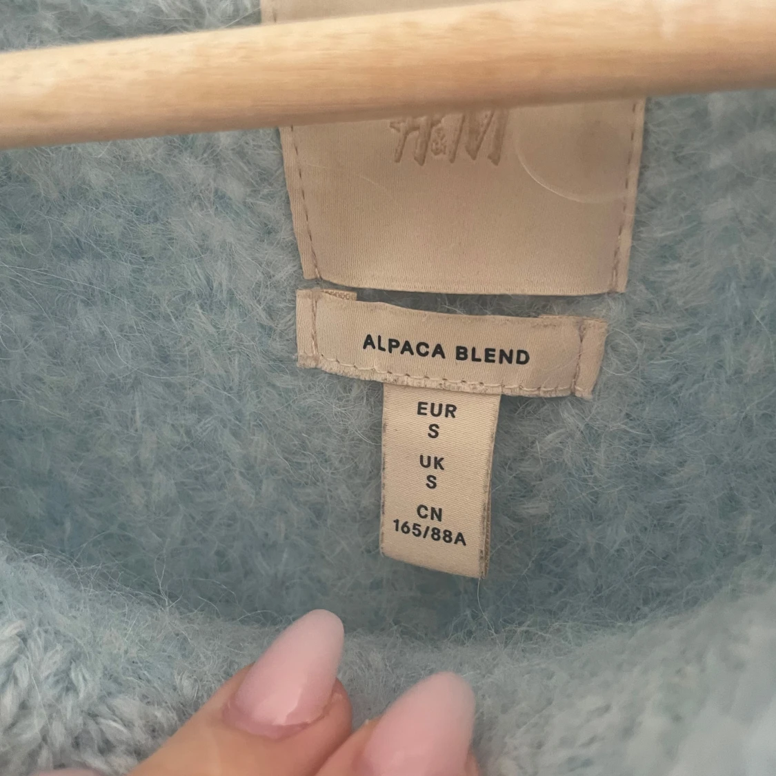 Supermysig ljusblå stickad tröja från H&M i alpackablandning. Tröjan har en loose passform, breda ärmar och ribbade muddar. Perfekt för kyliga dagar när du vill vara både varm och snygg.