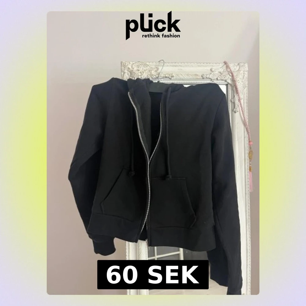 Svart hoodie med dragkedja och huva. Tröjan har två stora fickor framtill och snörning i huvan. Perfekt för chill dagar eller när du vill ha en enkel och stilren look. Materialet känns mjukt och bekvämt.