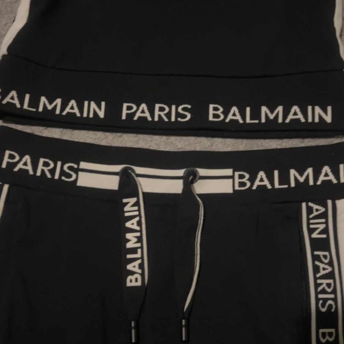 Snygg sällsynt svart tröja från Balmain med vita detaljer och logotyp längs ärmarna och midjan. Tröjan har långa ärmar och en stilren design som passar perfekt för en trendig look.