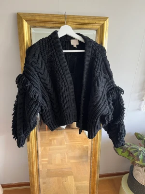 Stickad tröja med fransar. Den är bara använd en gång så i jättefint skick. Material är akryl, poly och ull.