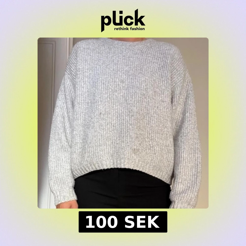 Mjuk och stickad tröja i ljusgrått. Tröjan har en enkel, ribbad struktur och rund halsringning. Den har två fläckar som syns på sista bilden.