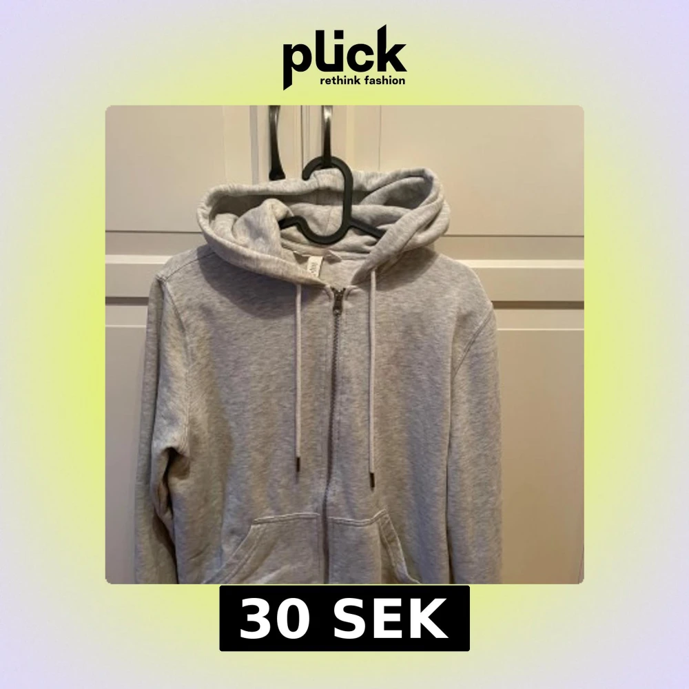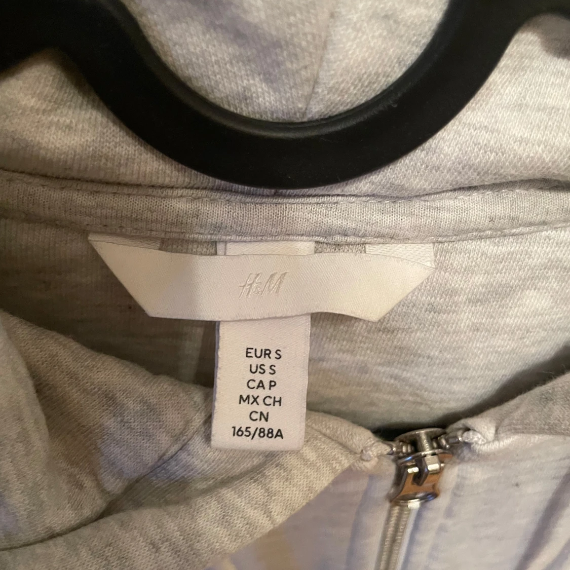 Ljusgrå hoodie från H&M i storlek S. Tröjan har huva med snörning, hel dragkedja framtill och två fickor. Perfekt för chill dagar eller när du vill ha en enkel och clean look. Tillverkad i mjuk bomullsblandning.