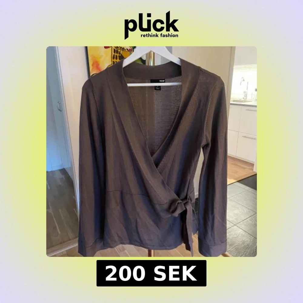 Säljer en brun omlottkofta från H&M i storlek S. Koftan har långa ärmar, knyt i sidan och är tillverkad i ett tunt, mjukt material som känns skönt mot huden. Perfekt för lager på lager och enkel att styla till olika looks.
