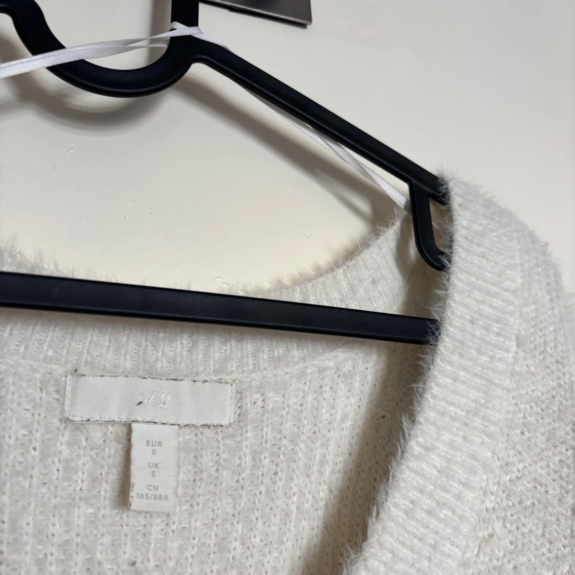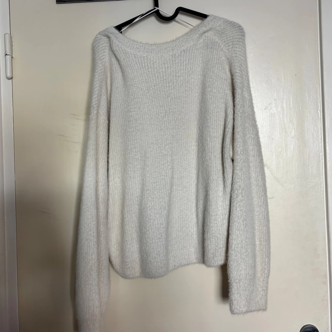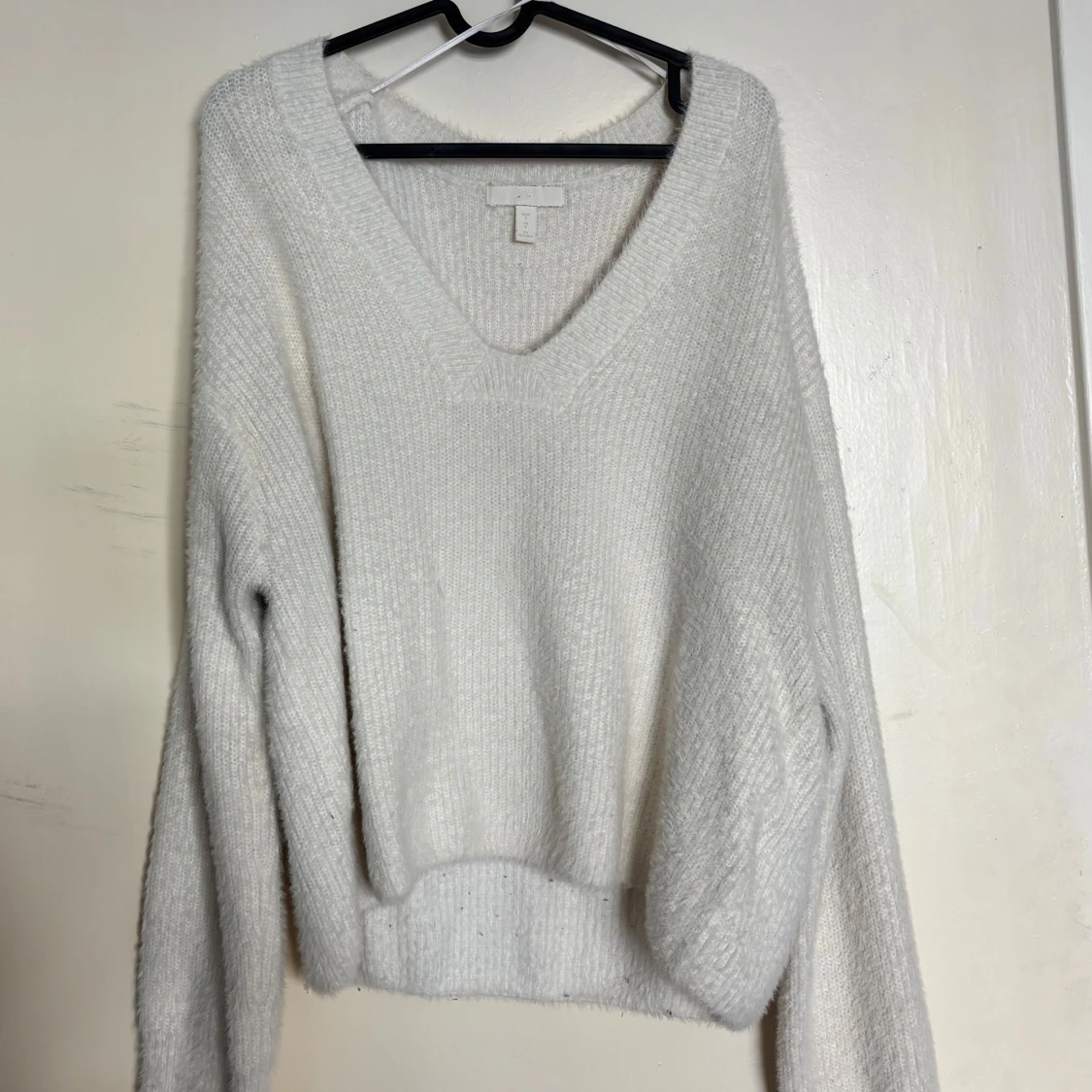 Mysig vit stickad tröja från H&M med v-ringning och långa ärmar. Perfekt för lager-på-lager och passar till många olika stilar. Tröjan har en avslappnad passform och ribbade muddar.