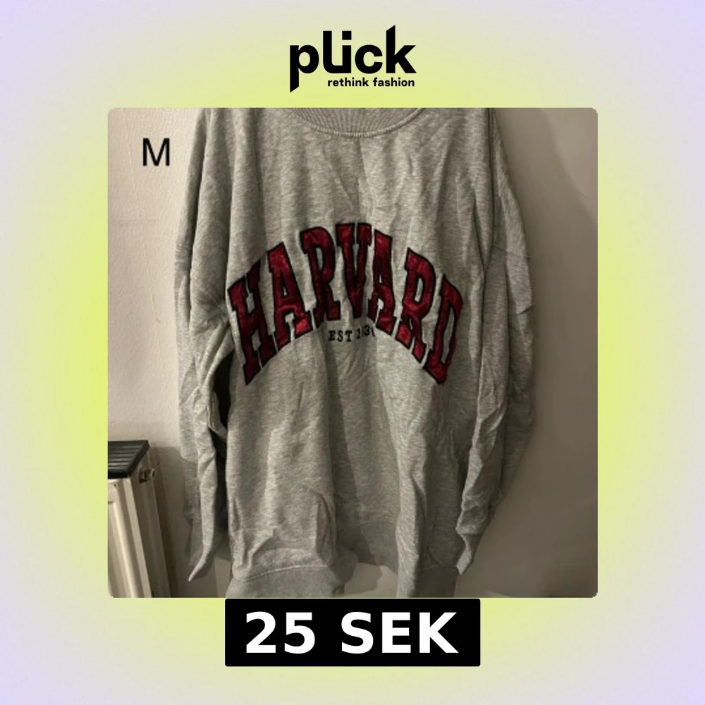 Säljer en grå sweatshirt med stort rött Harvard-tryck på framsidan. Tröjan har långa ärmar och en rund halsringning. Perfekt för en avslappnad stil eller som en del av en lager-på-lager-look.