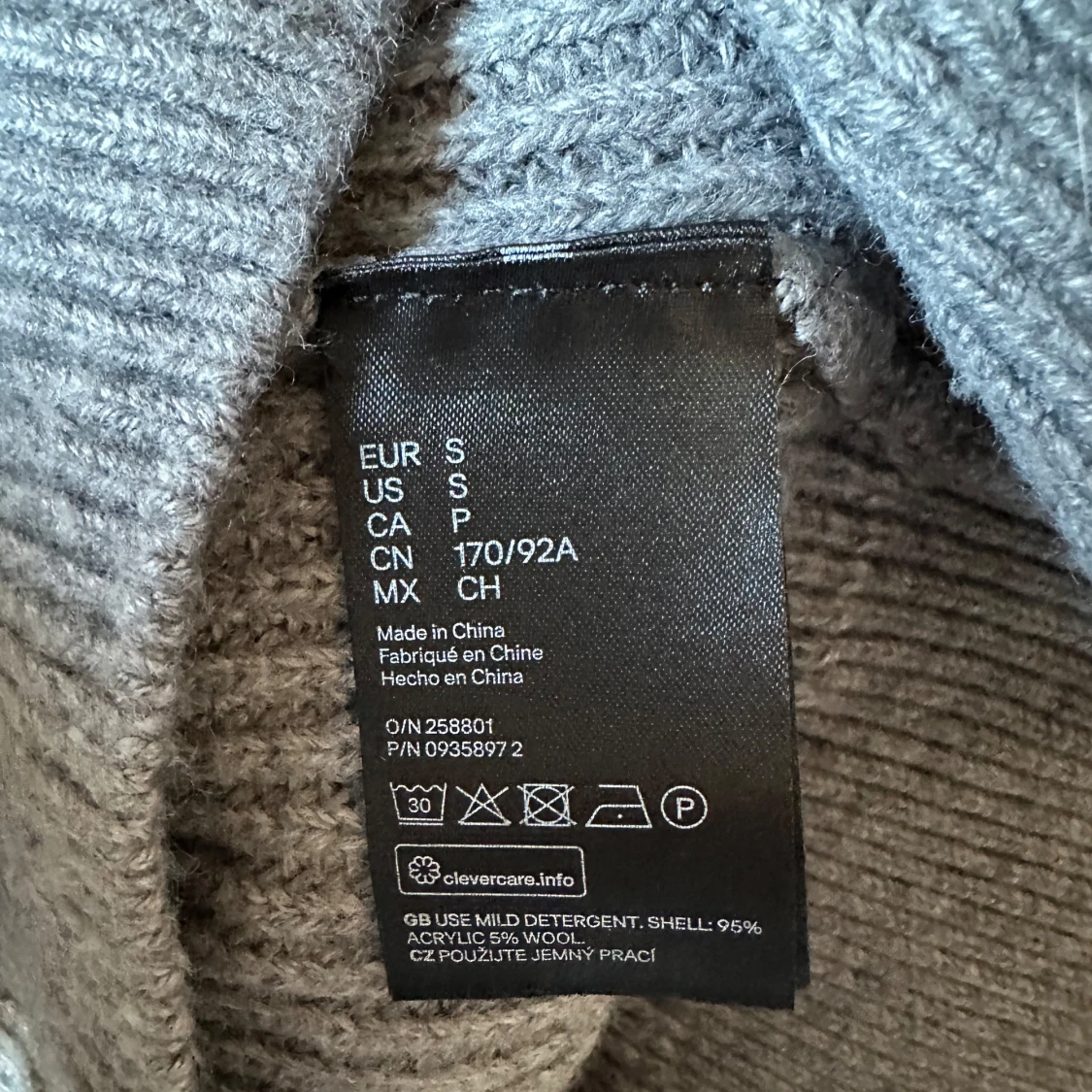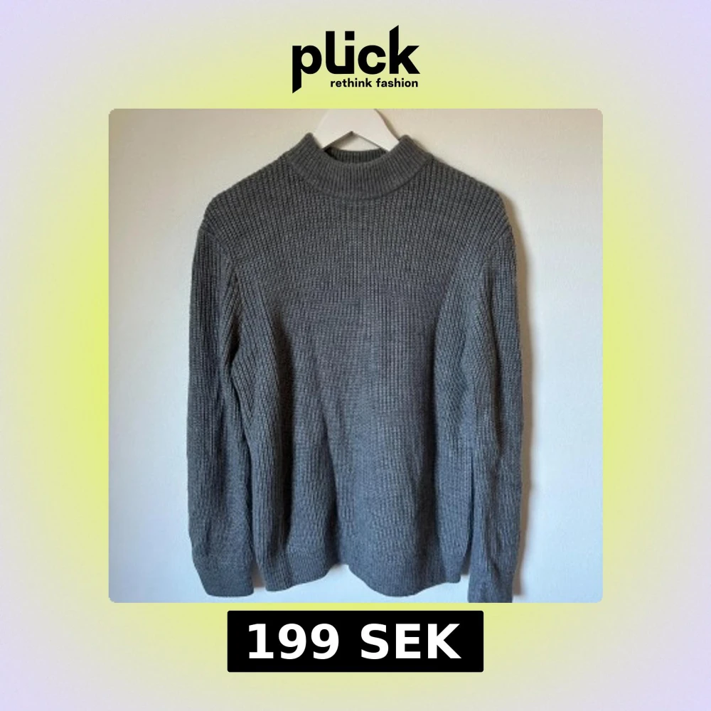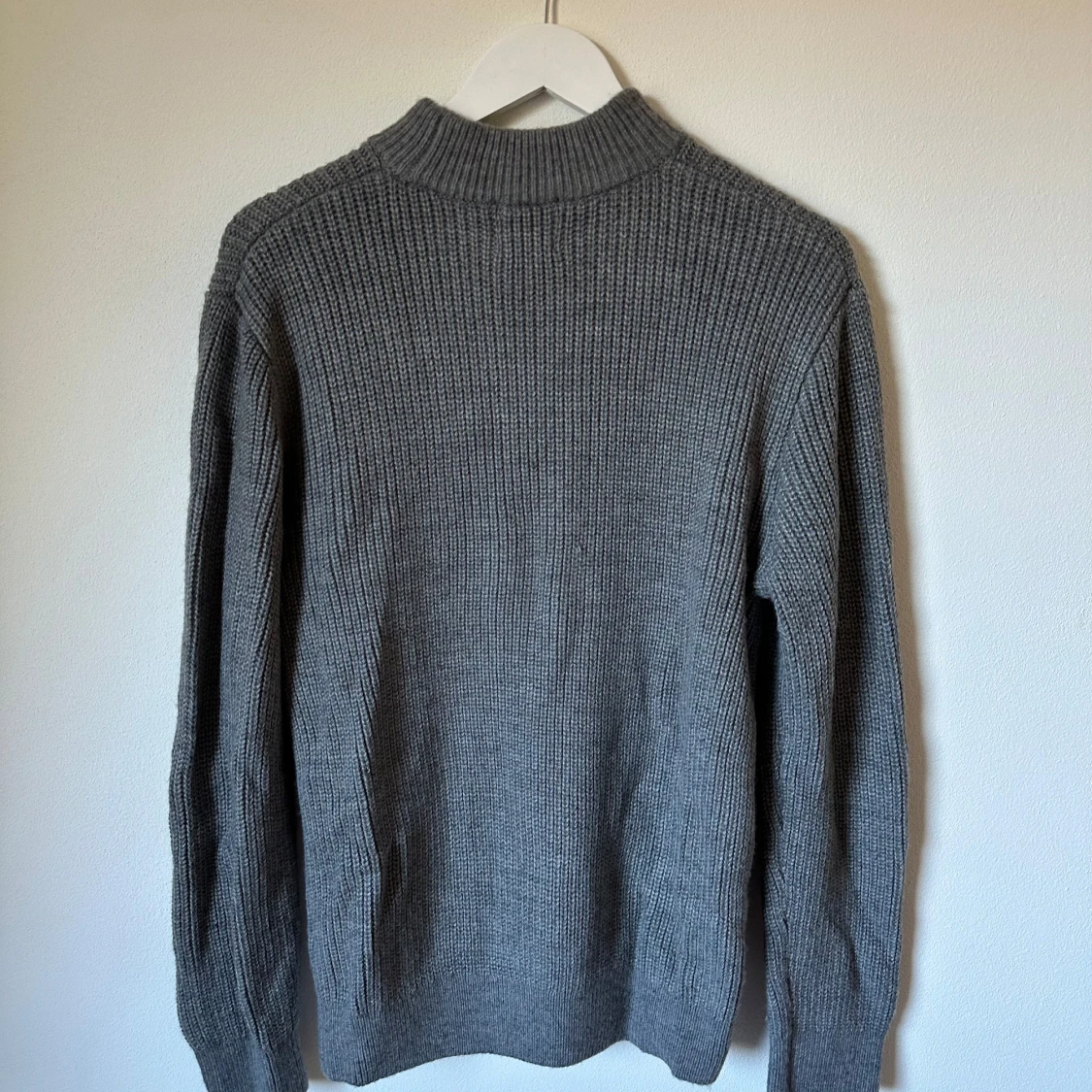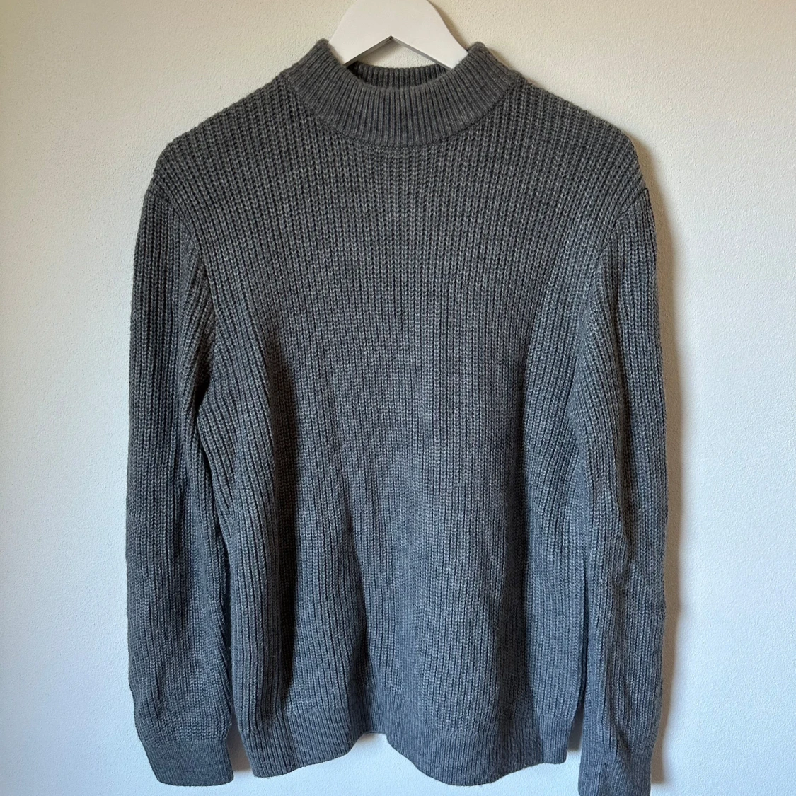 Mysig grå stickad tröja från H&M med högre ribbad krage och långärmad modell. Tröjan är i grovstickat material och passar perfekt när det är kyligt ute. Tillverkad i 95% akryl och 5% ull för en skön känsla. 3R21