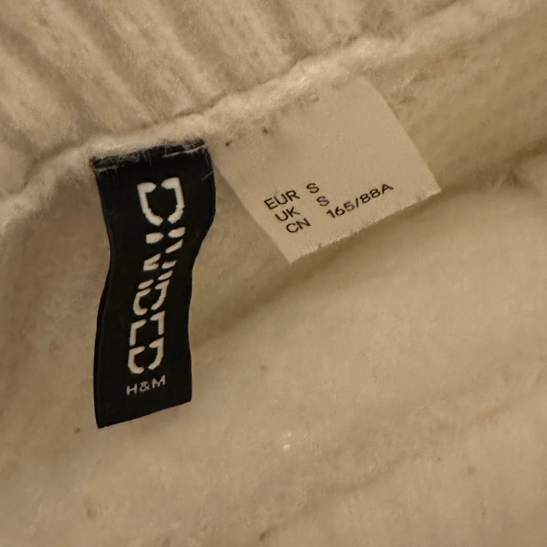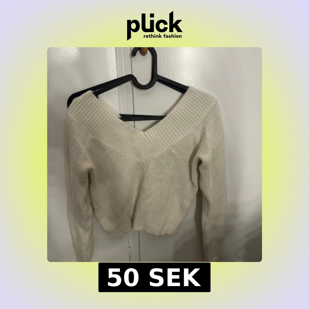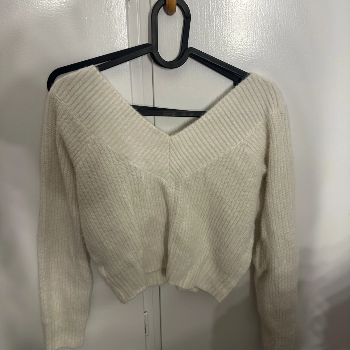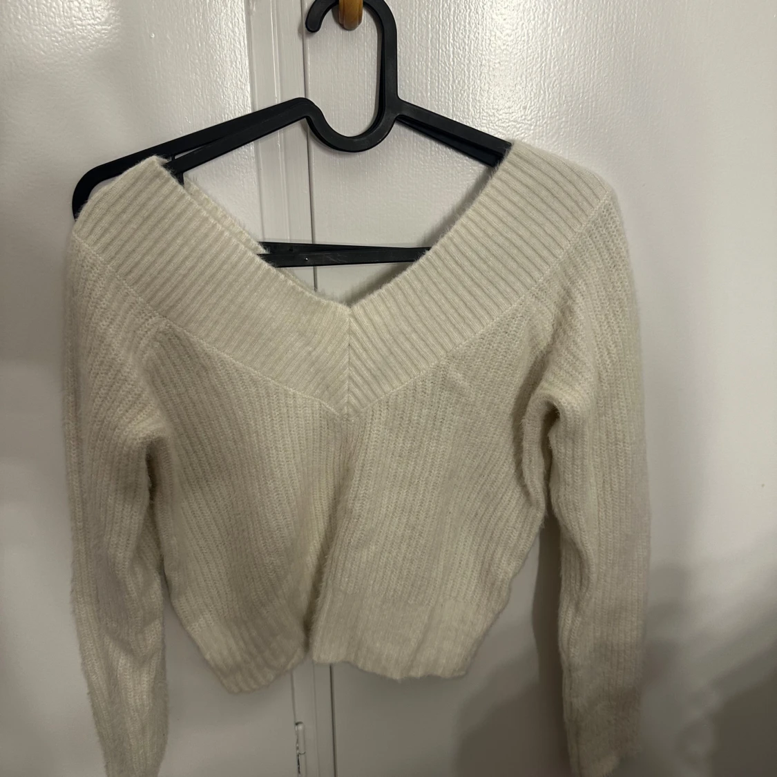 Supermysig vit stickad tröja från H&M med bred v-ringning och ribbade detaljer. Tröjan har lång ärm och en lite croppad passform som ger en trendig look. Perfekt att styla med jeans eller kjol för en chill vibe.