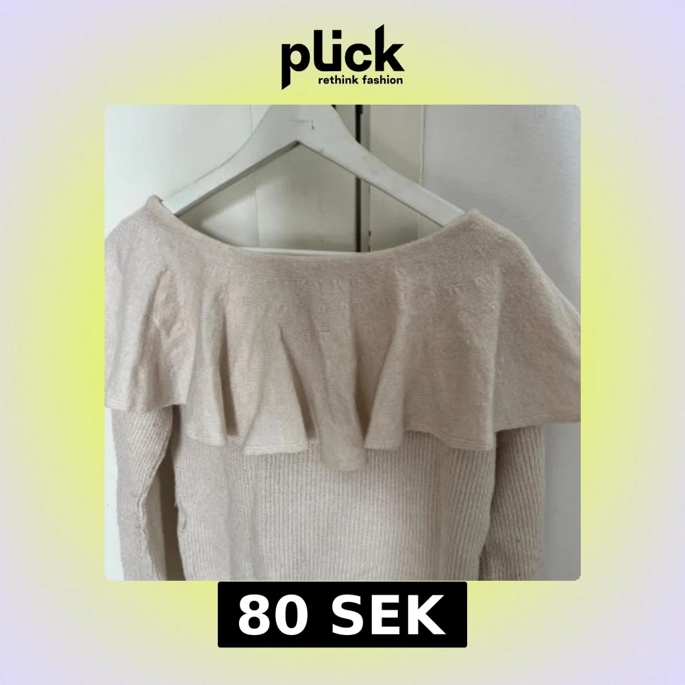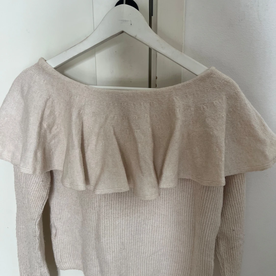 Superfin beige stickad tröja med bred volang över axlarna. Tröjan har en offshoulder-design och är ribbstickad i materialet, vilket ger en snygg och trendig look. Perfekt för dig som gillar mjuka färger och detaljer som sticker ut.