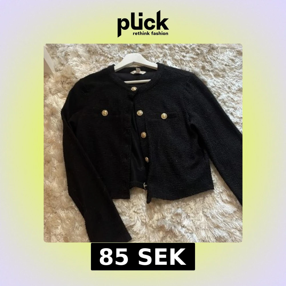 Stilren svart kofta med rund hals och snygga guldknappar framtill. Koftan har en lätt strukturerad yta och två dekorativa fickor på bröstet. Perfekt för dig som gillar klassiska detaljer och vill ha en chic look.