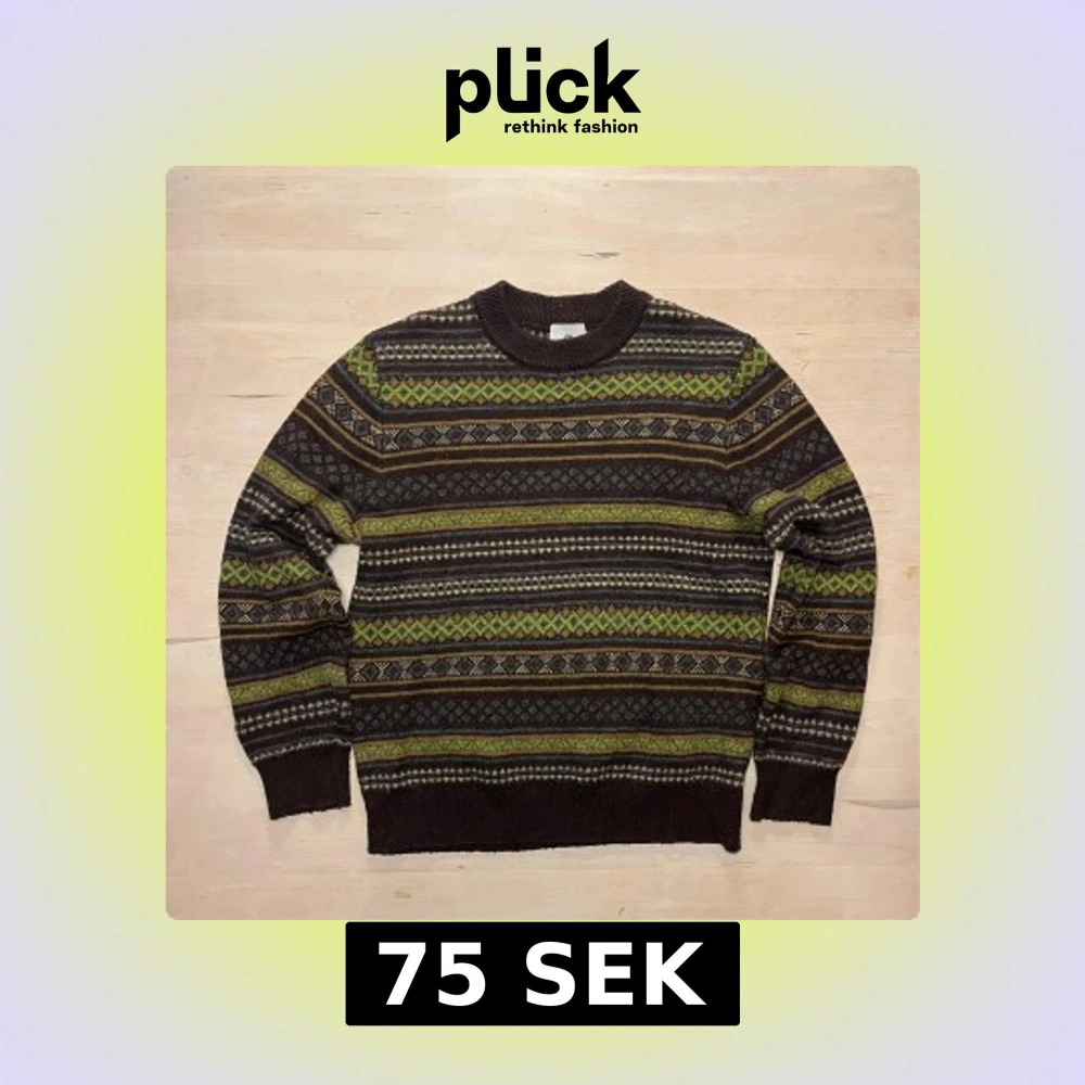 Säljer en brun stickad tröja från H&M med gröna, gula och grå detaljer i ett klassiskt mönster. Tröjan har rund halsringning, långa ärmar och ribbade muddar. Perfekt för dig som gillar retrovibbar och vill ha något unikt i garderoben.