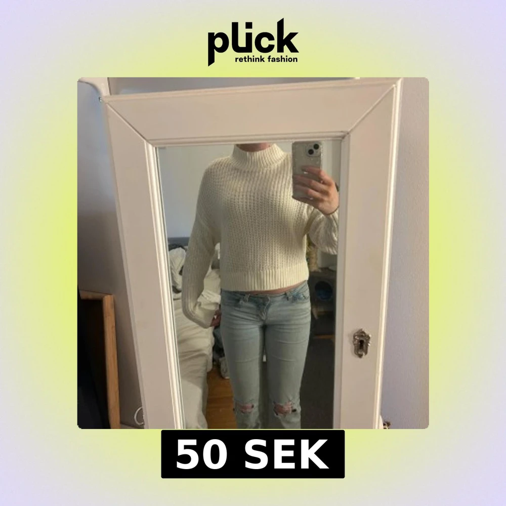 Säljer en stilren vit stickad tröja med hög krage. Tröjan är croppad och har långa ärmar, perfekt för en trendig look. Passar bra till jeans eller kjol för en avslappnad stil.