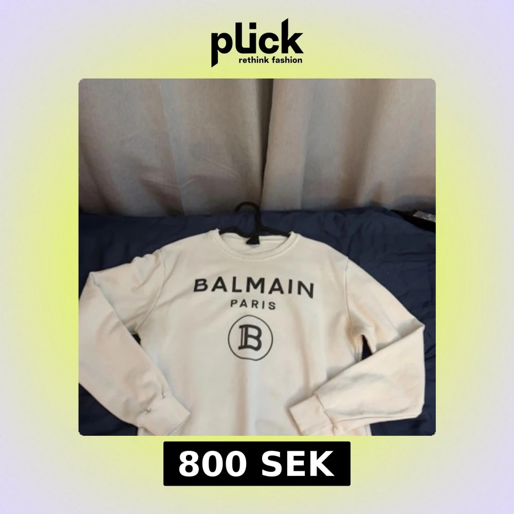 Säljer en vit sweatshirt från Balmain Paris med svart logga och tryck framtill. Tröjan har rund halsringning, långa ärmar och ribbade muddar vid ärmslut och nederkant. Perfekt för en clean och trendig look.