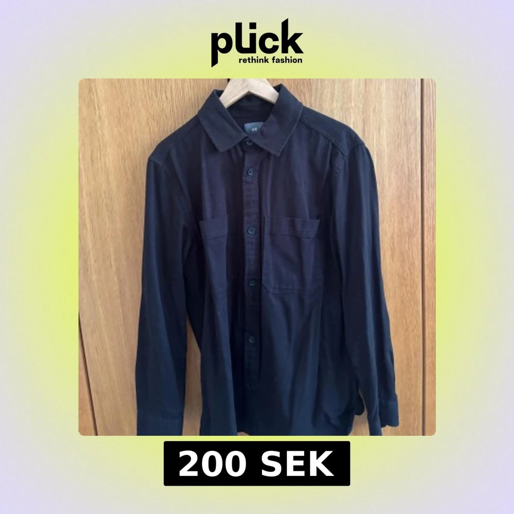 Svart overshirt från H&M i mjuk bomull. Skjortan har klassisk krage, två bröstfickor och knäppning framtill. Långärmad och med en rak, lite loose passform som funkar till många olika stilar.