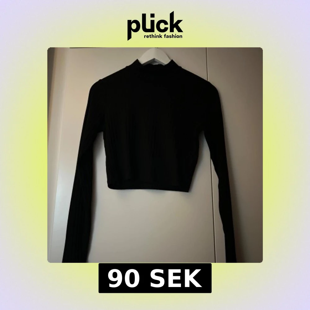 Snygg svart ribbad topp med lång ärm och croppad passform. Perfekt för en stilren look. Toppen har en hög krage som ger en elegant touch. Passar inte mig längre därav säljer jag