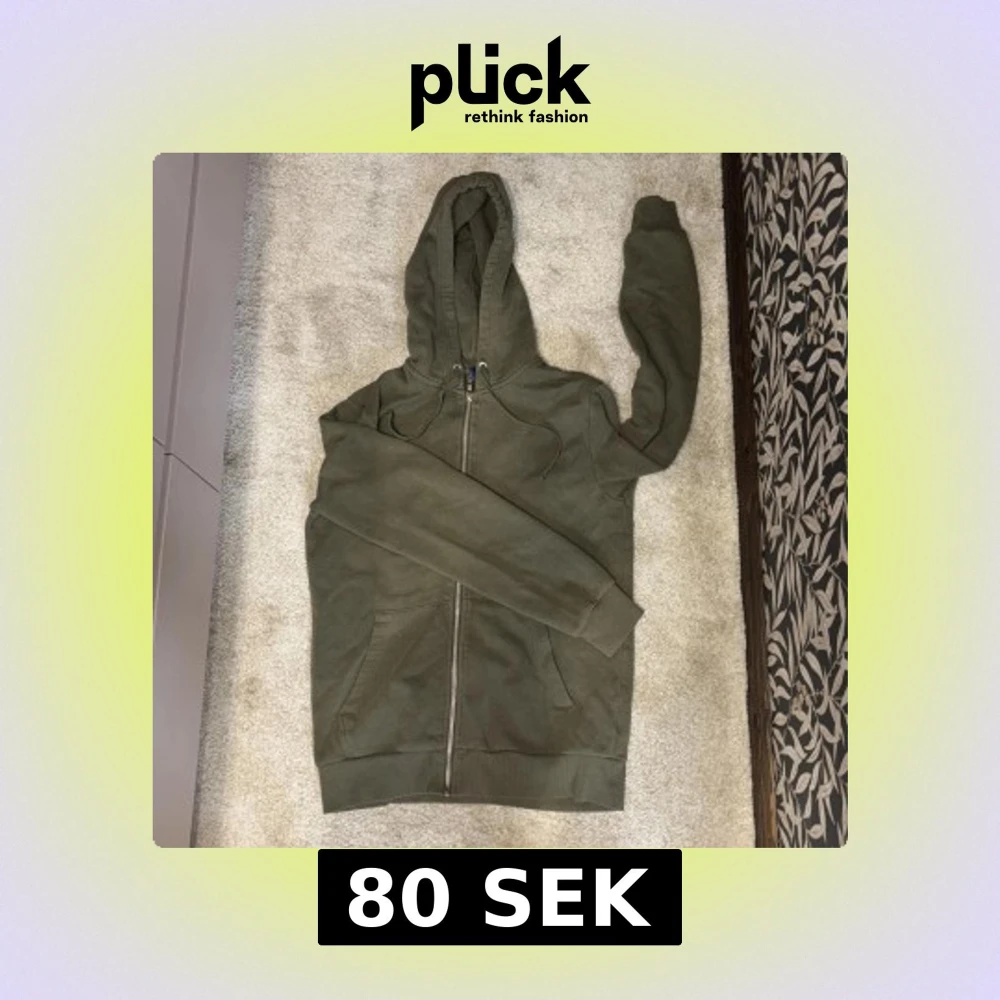 Säljer en olivgrön hoodie med dragkedja och huva. Tröjan har långa ärmar och ribbade muddar vid ärmslut och nederkant.