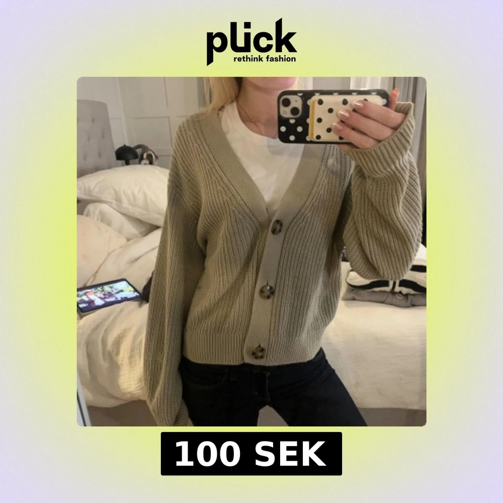 Säljer en grön stickad kofta från H&M i storlek S. Koftan har grovstickad struktur, stora mörka knappar framtill och en djup v-ringning. Modellen är loose fit med långa ärmar och breda muddar. Perfekt att slänga över en t-shirt för en chill look.