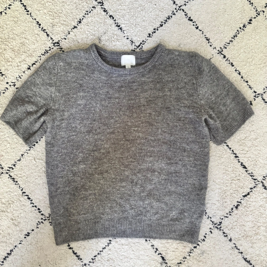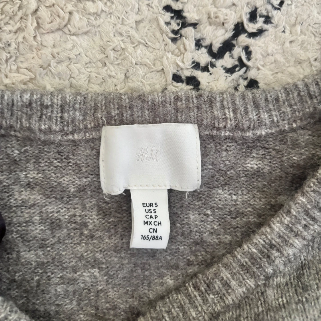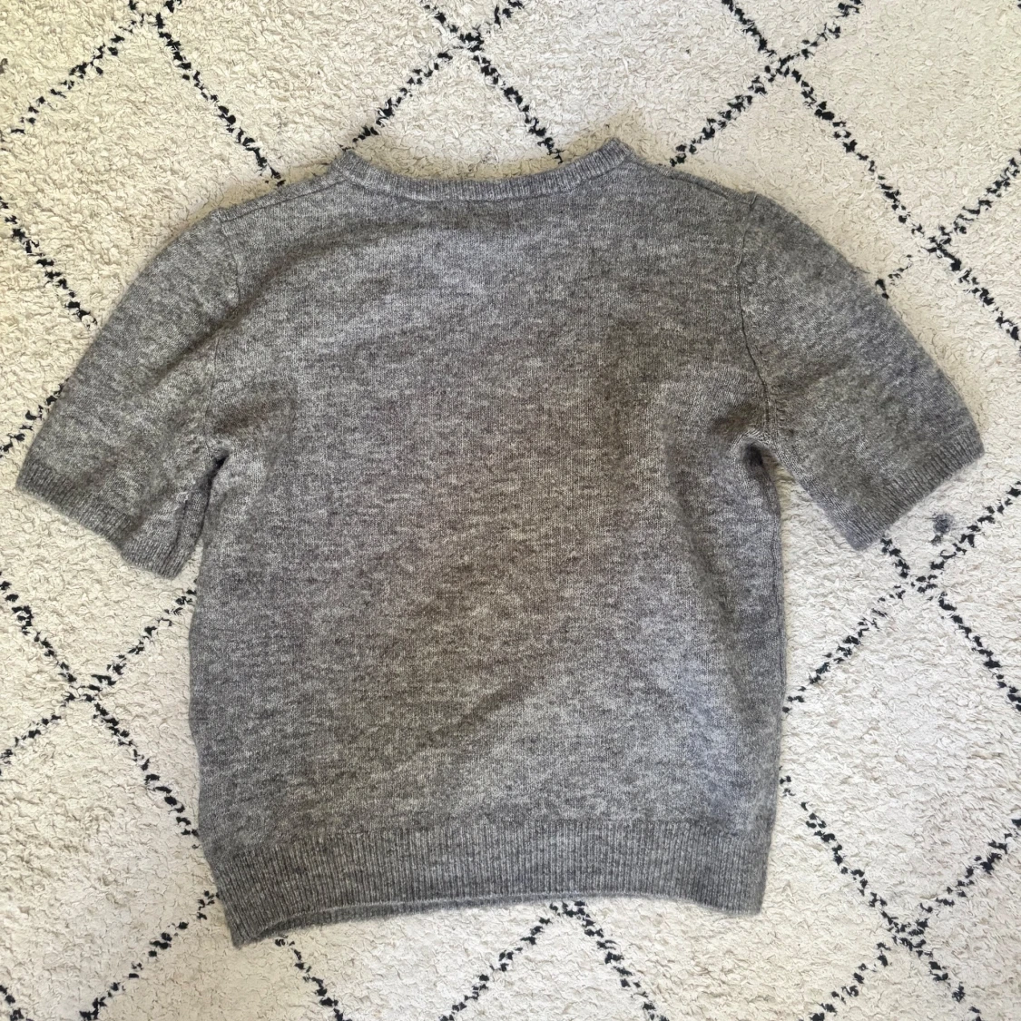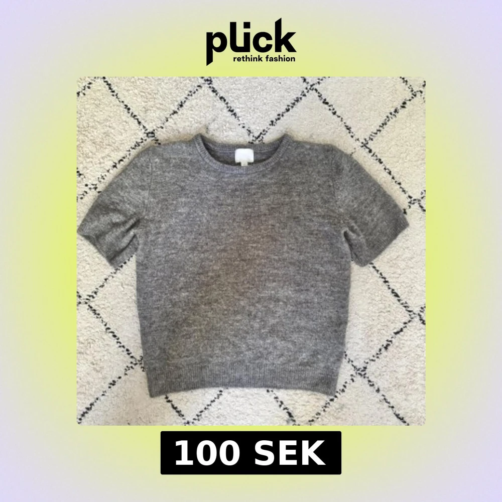 En enkel och snygg grå stickad tröja från H&M i storlek S. Modellen har korta ärmar, rund hals och ribbade muddar vid ärmslut och nederkant. Perfekt att matcha med jeans eller kjol för en chill look.