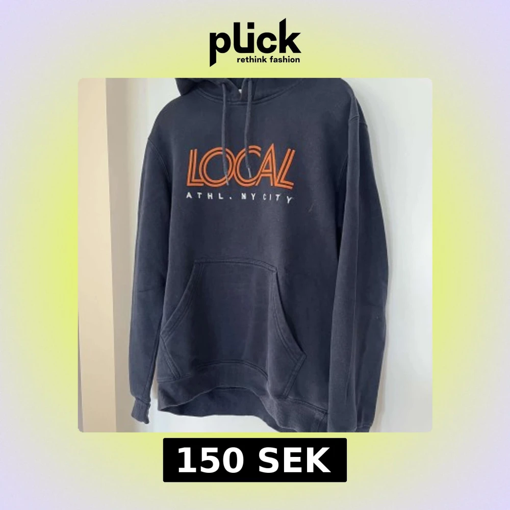 Svart hoodie från H&M med orange och vit text 'LOCAL ATHL. NYCITY' på bröstet. Klassisk känguruficka framtill, huva med snörning och mjukt material på insidan. Perfekt för chill dagar eller när du vill ha en avslappnad stil.