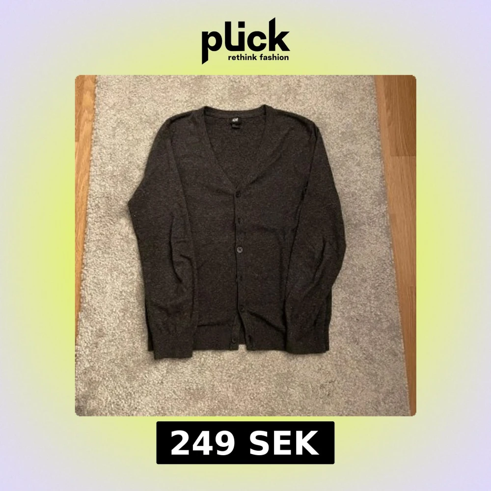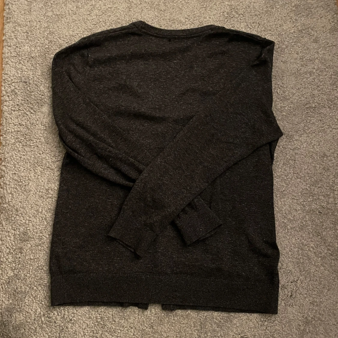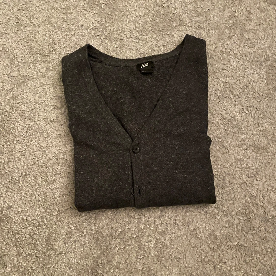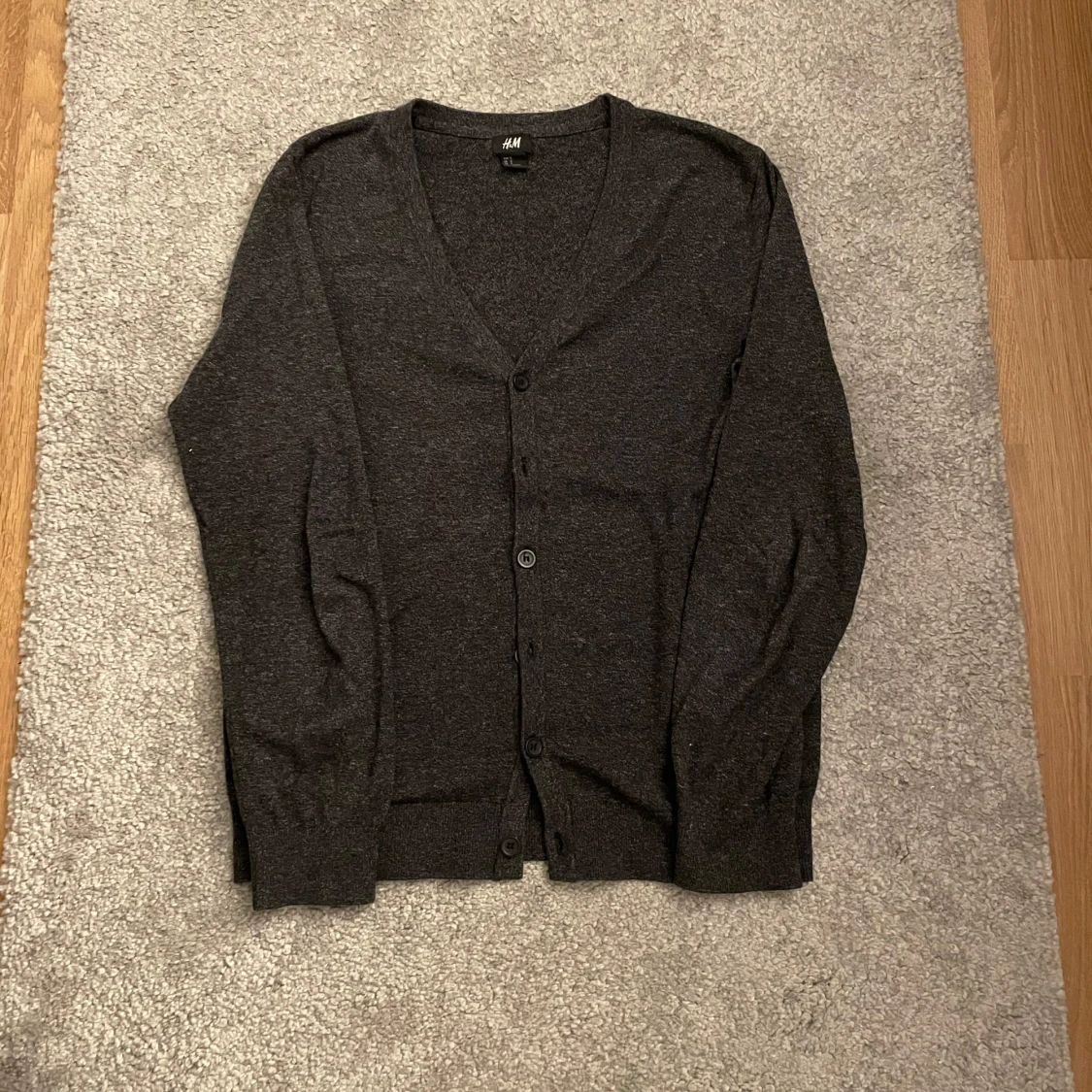 En stilren mörkgrå kofta från H&M med v-ringning och knäppning framtill. Koftan har långa ärmar och är tillverkad i ett mjukt, tunt material som passar perfekt för lager-på-lager. Enkel och klassisk design som funkar till det mesta.