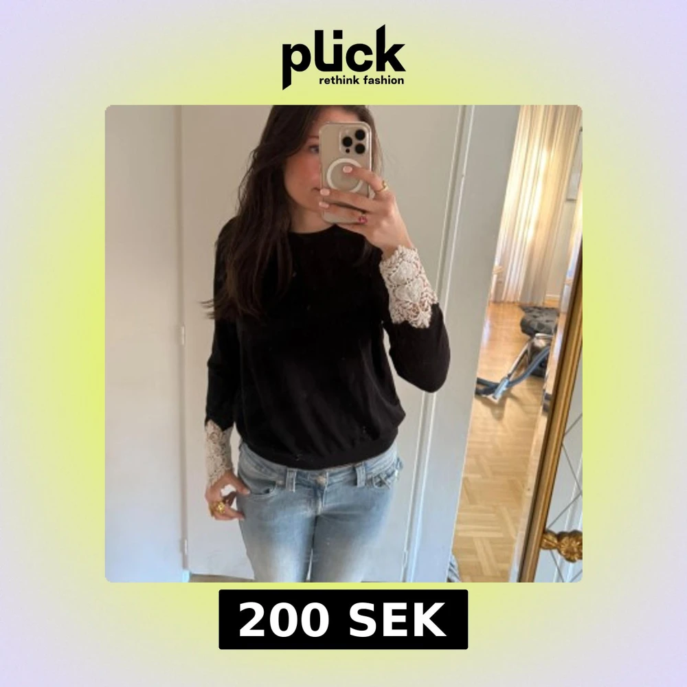 Säljer en svart tröja från H&M med vackra vita spetsdetaljer på ärmarna och ryggen. Den är i storlek L men passar i S