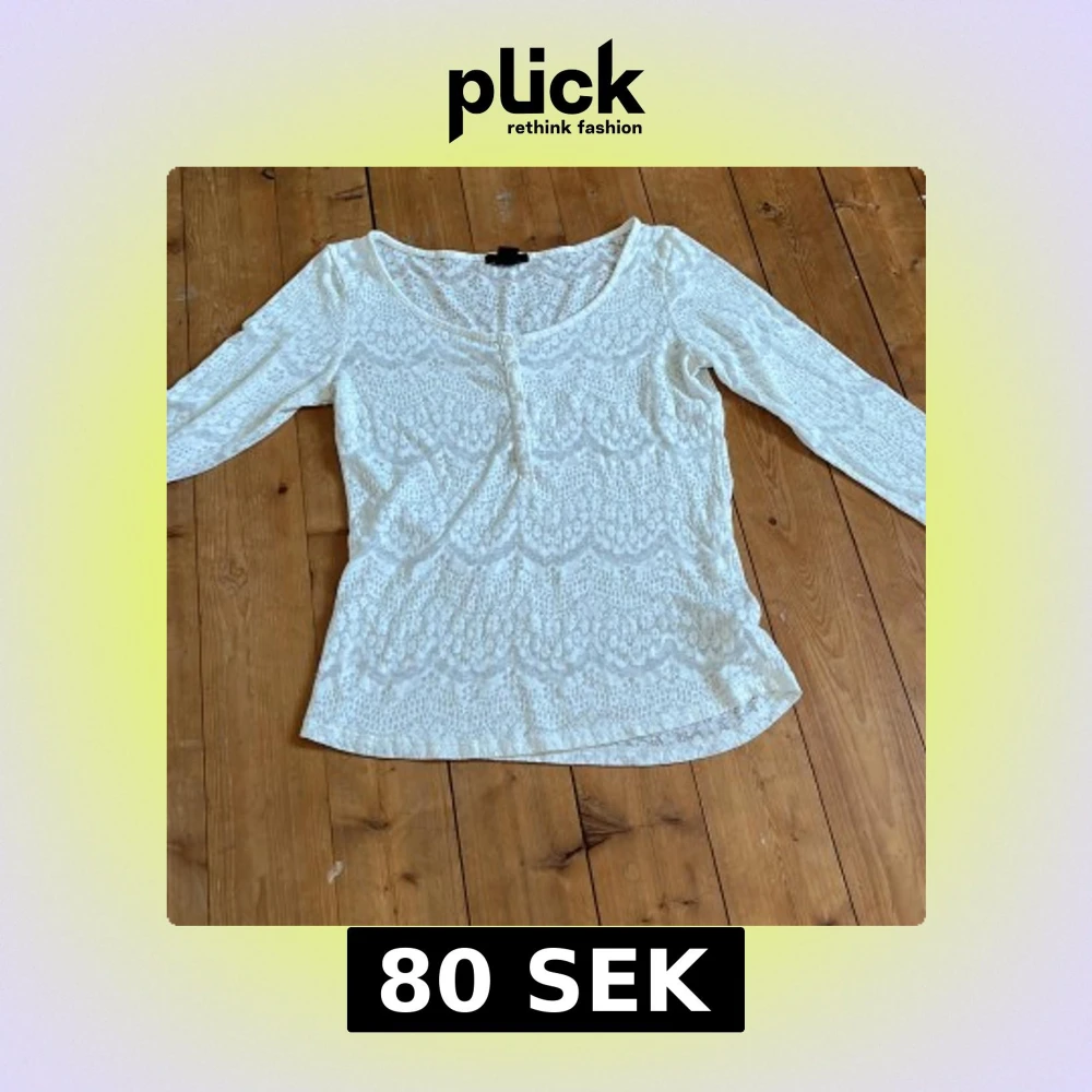 Säljer en vit blus med spetsmönster och rundad hals. Blisen har små knappar framtill. Den är lätt transparent och har en feminin, smickrande passform.