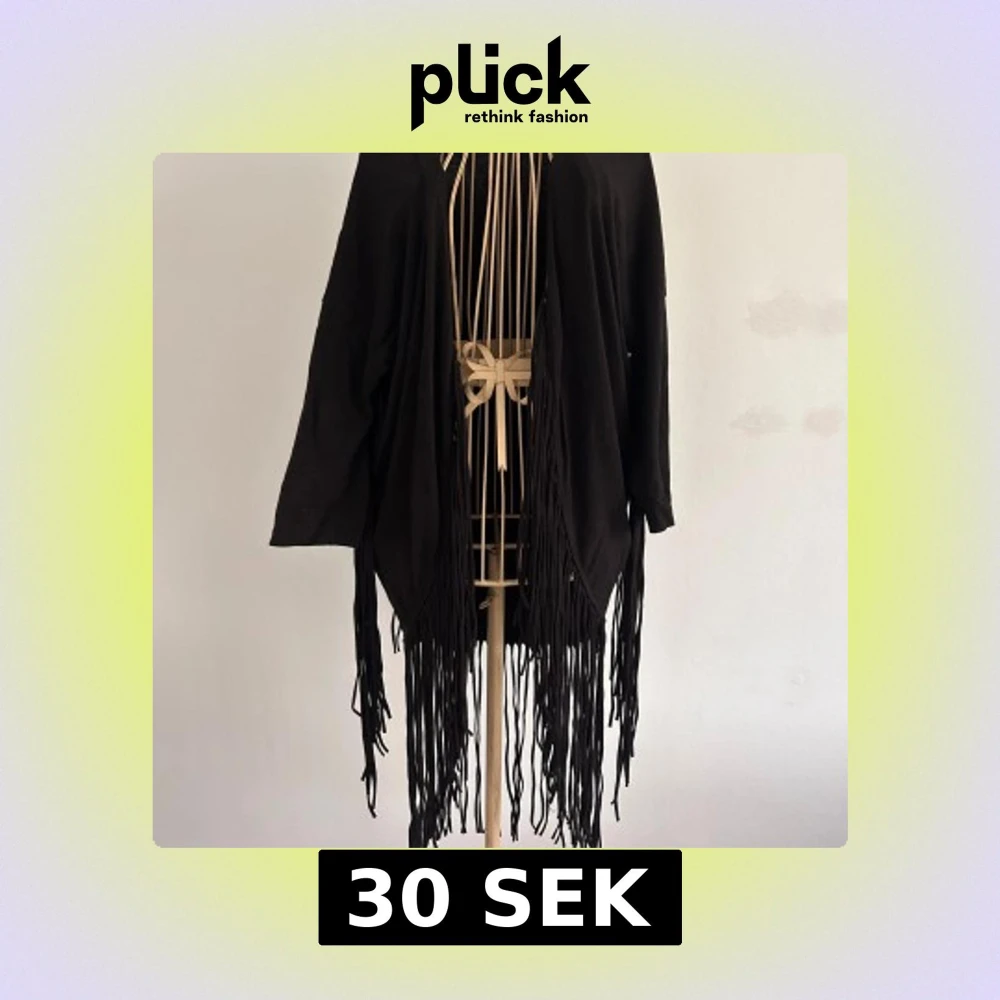 Svart kimono från H&M med coola fransdetaljer längs hela fram- och baksidan. Jackan är tillverkad i mjuk bomull med lite stretch för extra komfort. Perfekt för dig som vill sticka ut med en unik och trendig look. Stl S