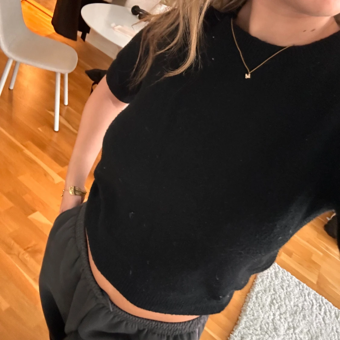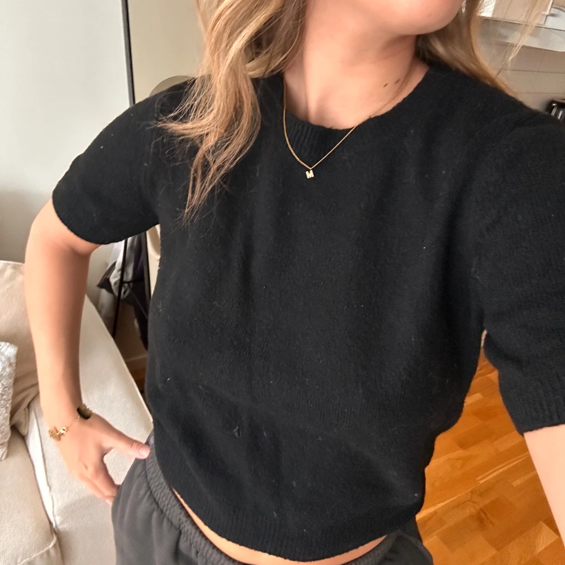 En svart stickad tröja med korta ärmar och rund hals. Modellen är något croppad