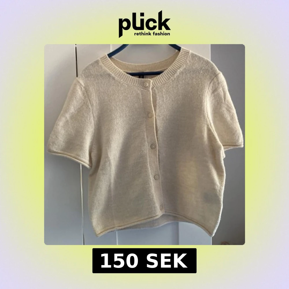 Säljer en beige, kortärmad kofta från H&M med rund hals och knappar framtill. Koftan är stickad i mjukt material och har ribbade detaljer vid hals och knappslå. Perfekt för lager-på-lager och chill stil.